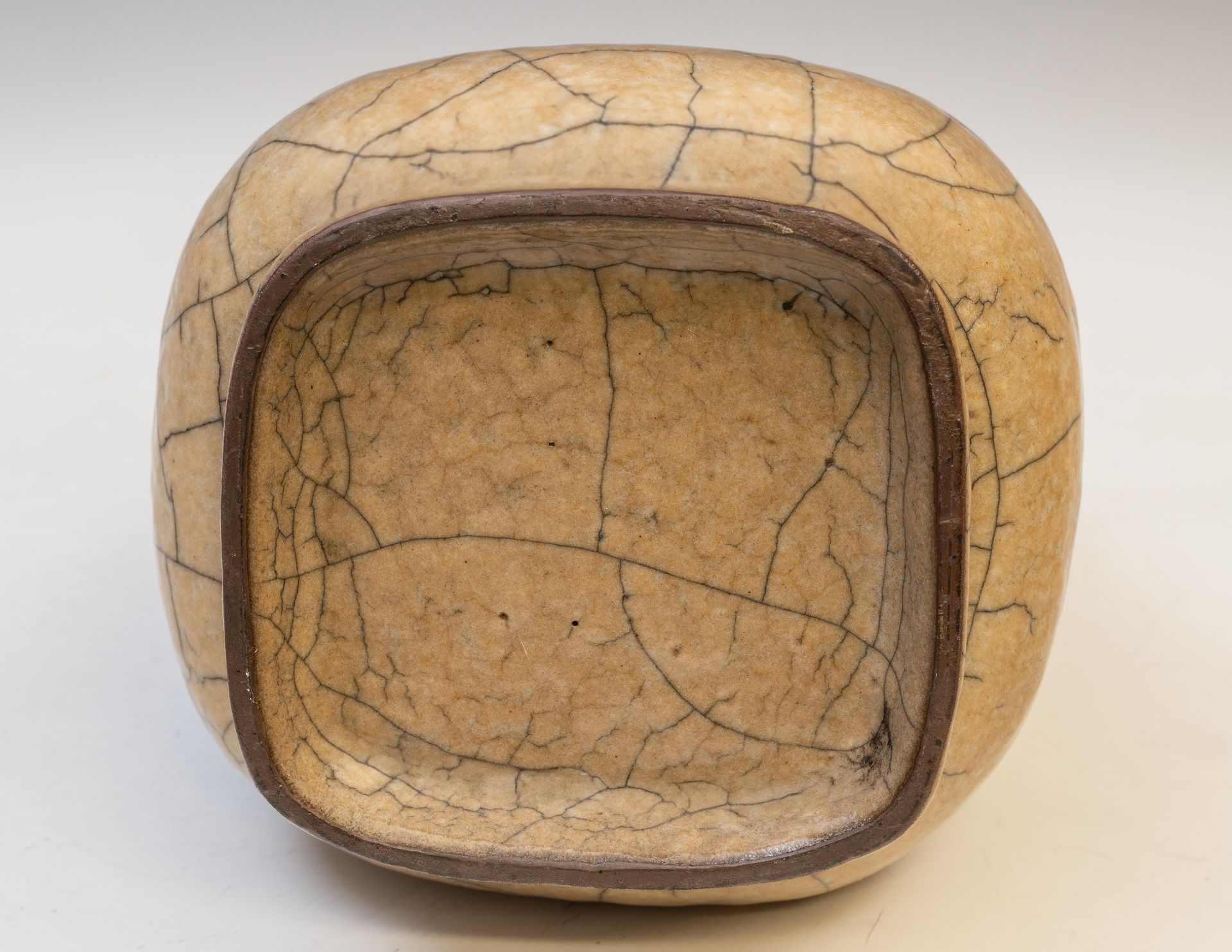 Jarrón Ge Kiln Ge Ware de las dinastías Song y Yuan del Sur: forma Hu cuadrada con asas de tubo y base de hierro