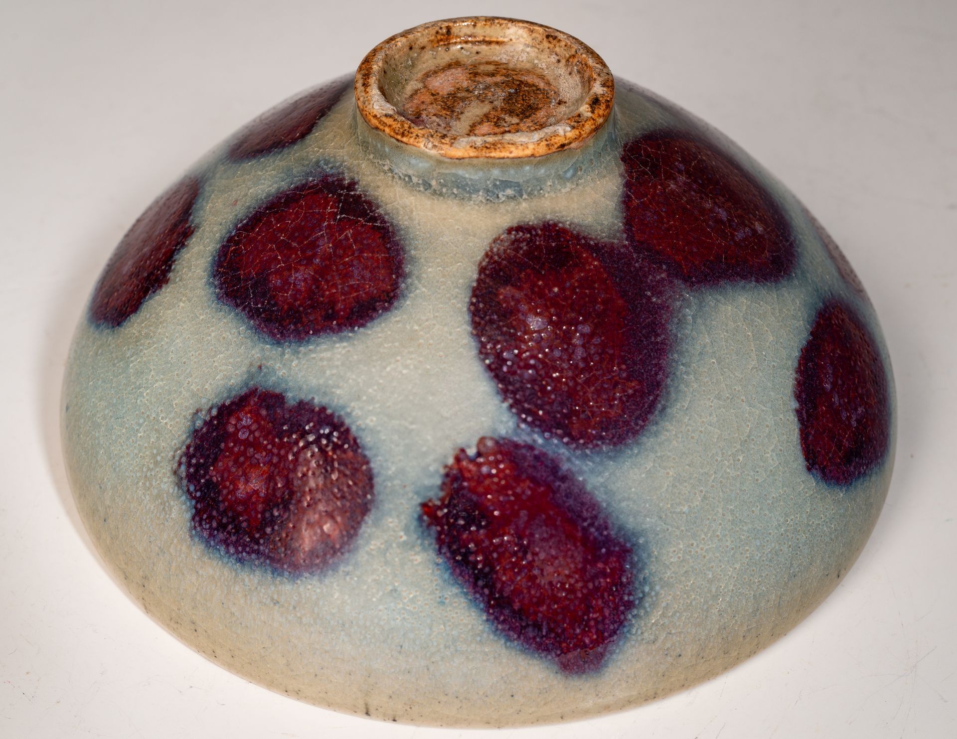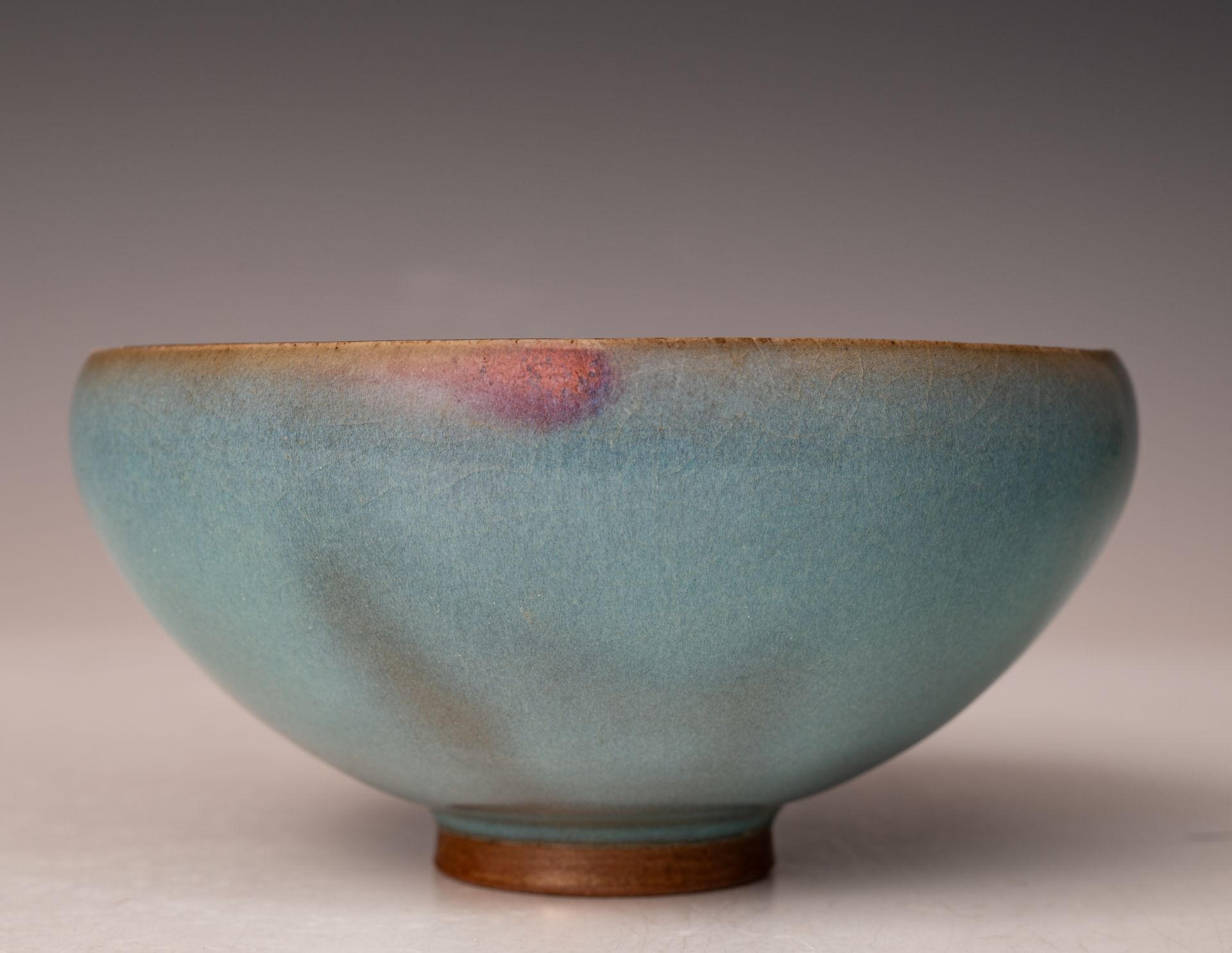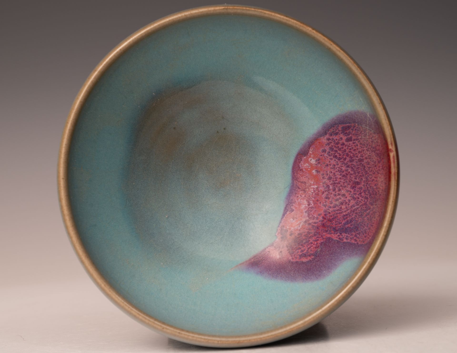 Dinastía Song. Este cuenco presenta una decoración interior con un toque púrpura rojizo sobre fondo azul y un ligero tono púrpura en el borde exterior, que se afina hasta adquirir un tono hongo en el borde.