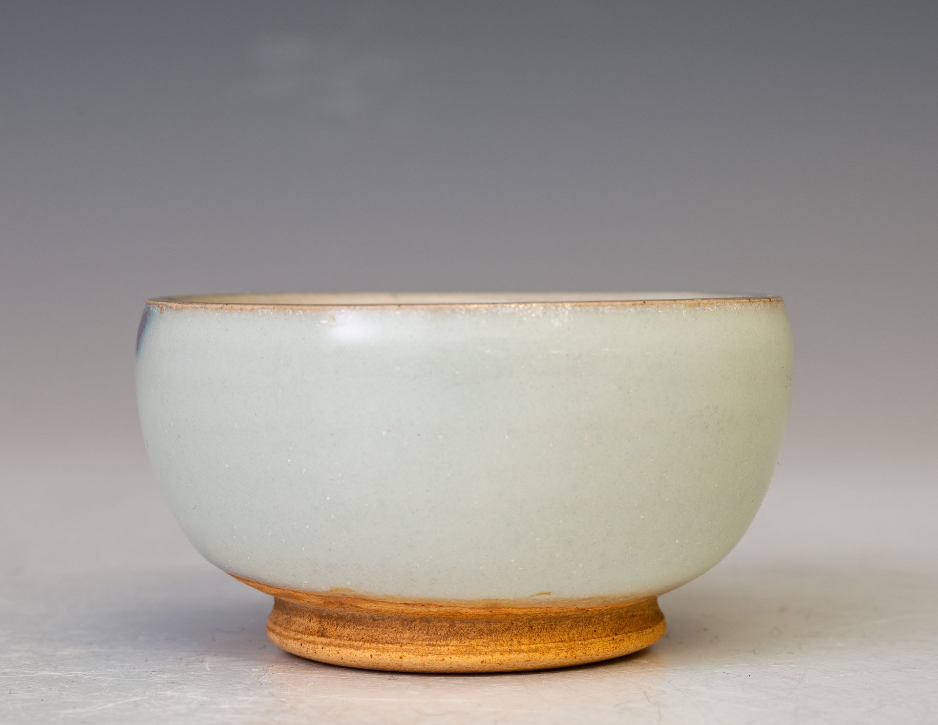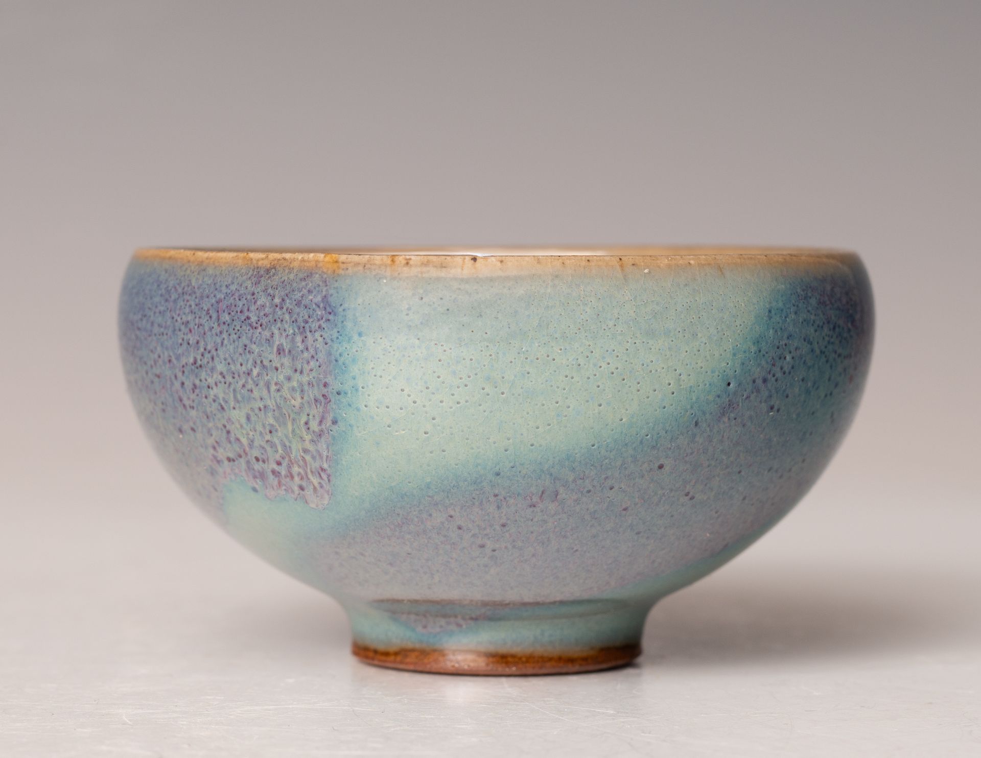 Este cuenco Jun de la dinastía Yuan, de color azul pálido, presenta toques violáceos y un tinte verdoso tanto en el interior como en el exterior del borde. Además, un sutil toque púrpura acentúa el borde. El cuenco mide 8,5 cm de diámetro. ppjrs