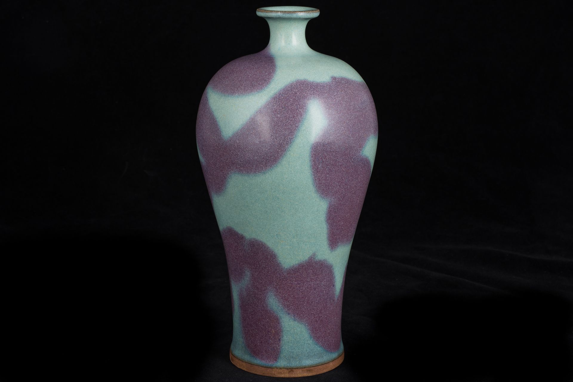 Jarrón Meiping de horno Jun de la dinastía Song del Norte, caracterizado por su engobe marrón y su exquisito craquelado fino, complementado con un toque púrpura. El jarrón mide aproximadamente 28 cm de altura. ppjrs