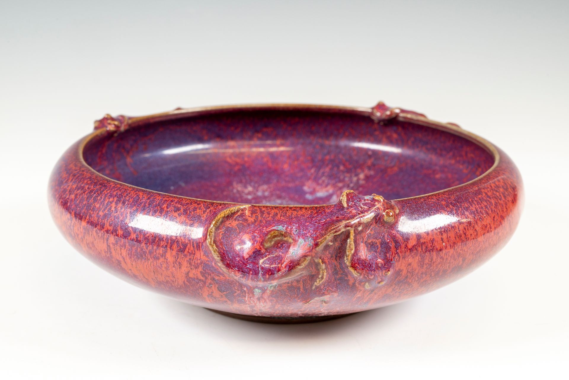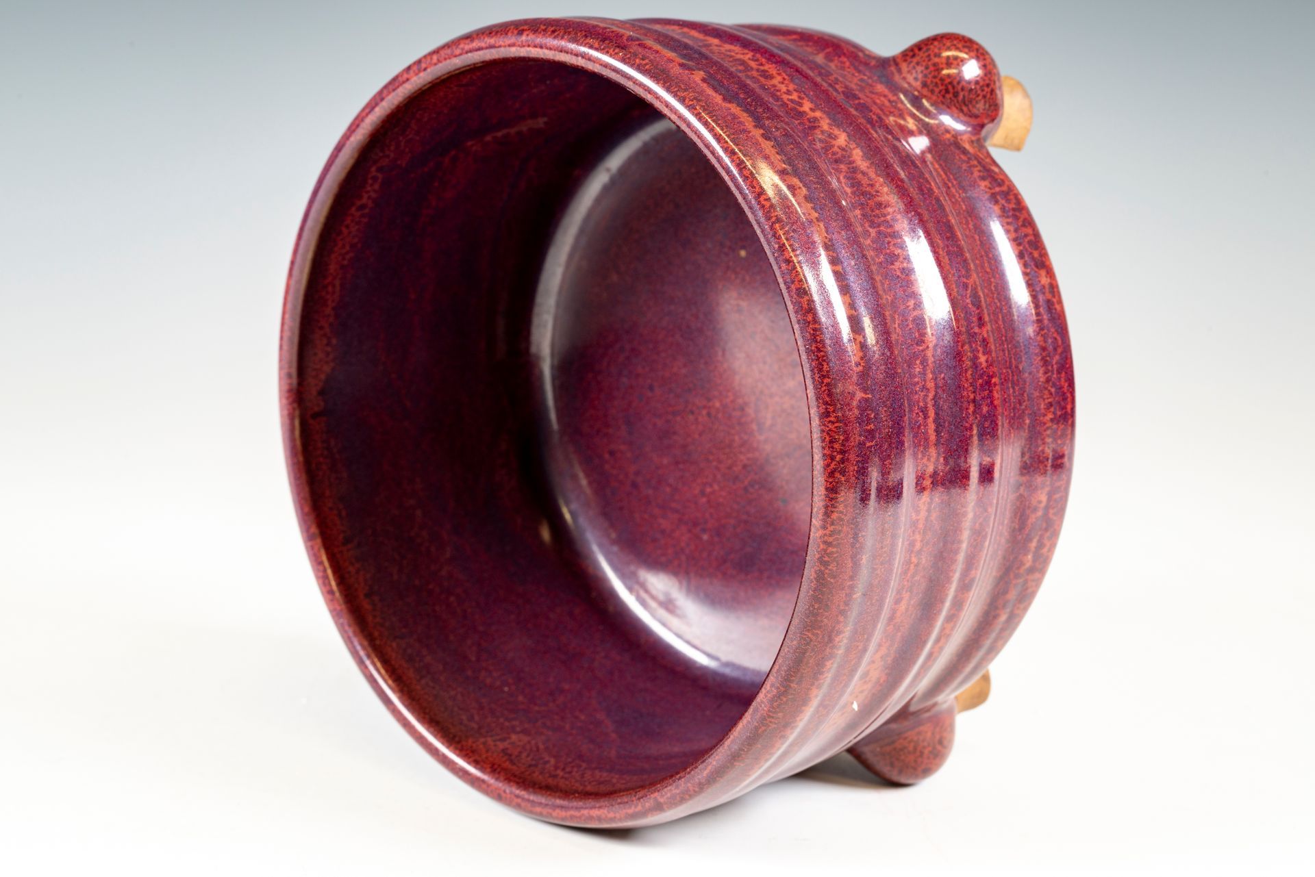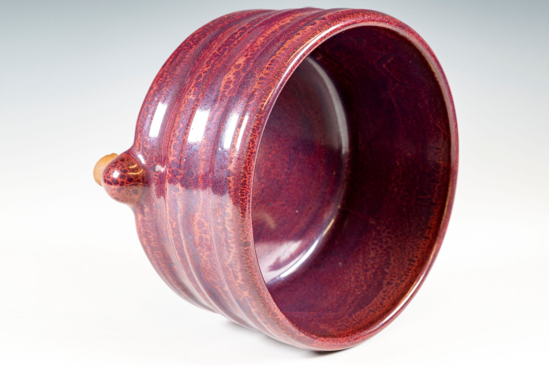 Esta pieza es una maceta Jun Ware de la dinastía Song, caracterizada por su distintivo borde y un vidriado rojizo. El interior presenta un tono azul, complementado con marcas de gusanos. Además, presenta zonas donde el vidriado se ha diluido, lo que le confiere un sutil tono de hongo en los bordes. La pieza mide aproximadamente 11,4 cm de altura. ppjrs