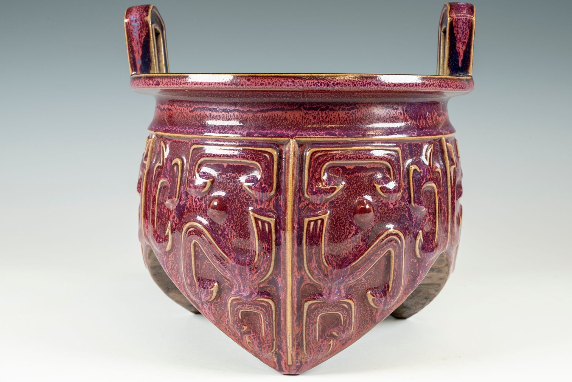 Vasija arcaica de forma Ding, de horno Jun, de principios de la dinastía Ming, con inscripción. Este quemador de incienso de color azul rojizo presenta un interior esmaltado en azul huevo de petirrojo, con signos de antigüedad como huellas de gusano, y una inscripción en la base. Mide aproximadamente 21,5 cm de alto. ppjrs
