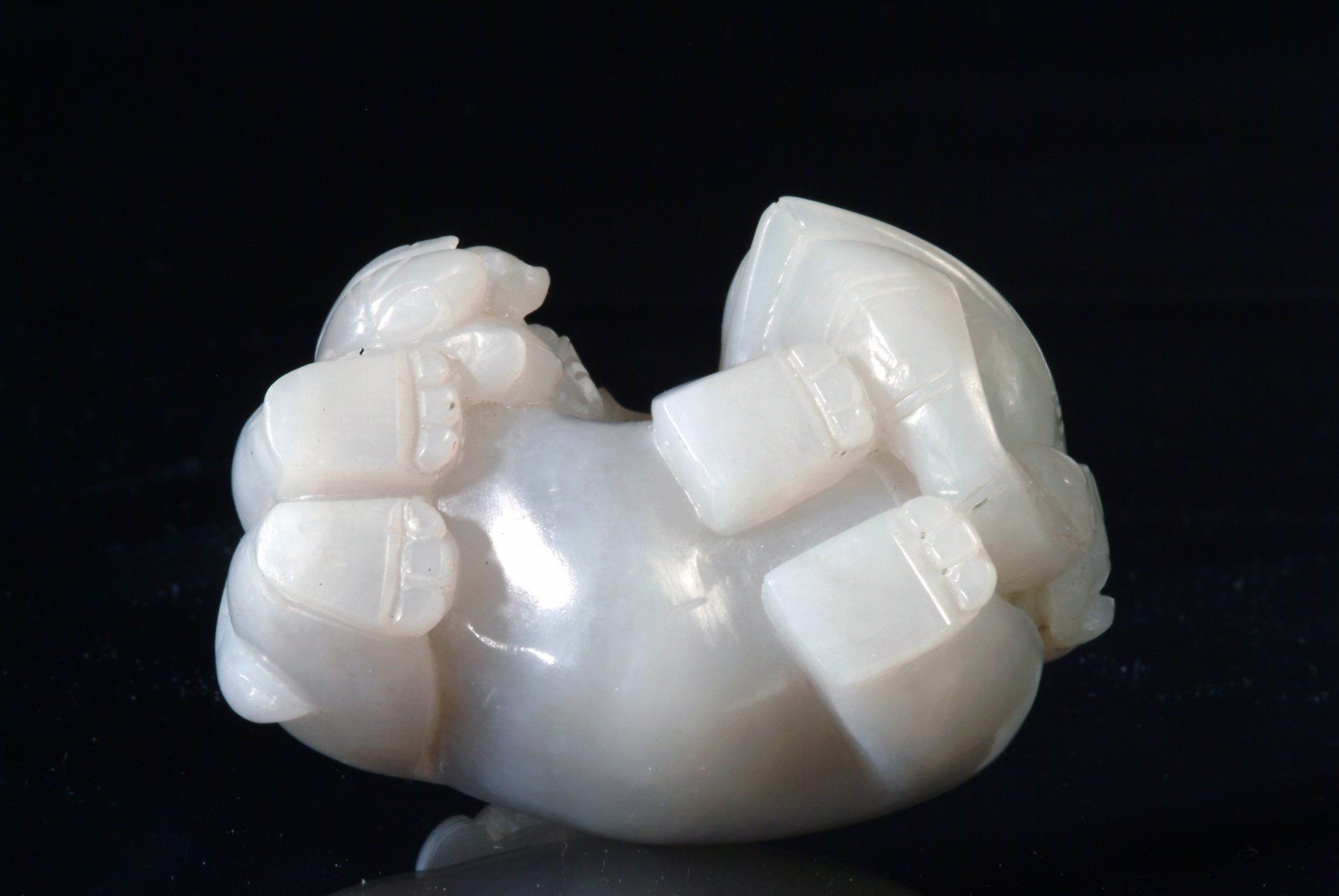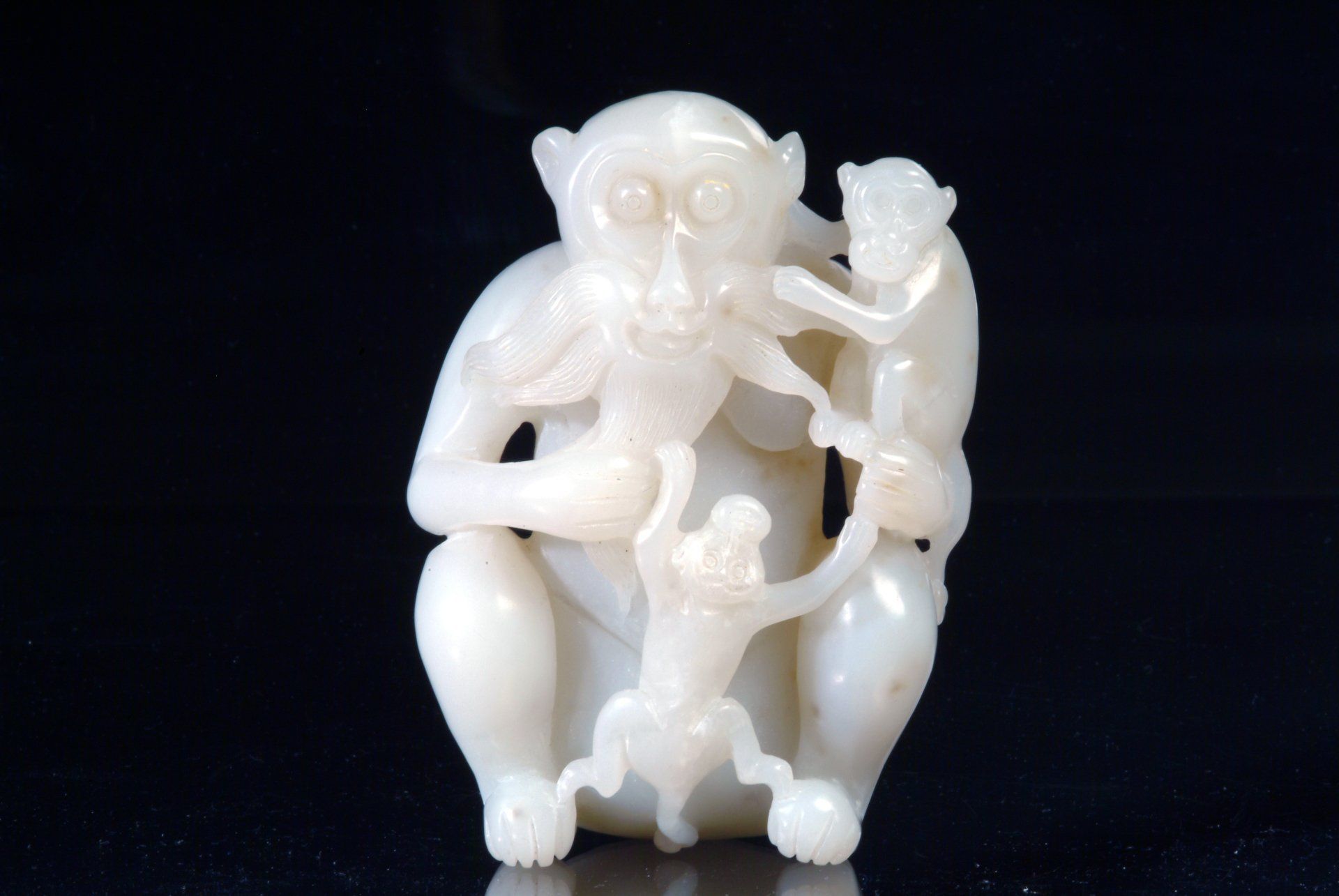 Escultura de jade blanco de la dinastía Qing que representa a los tres monos
