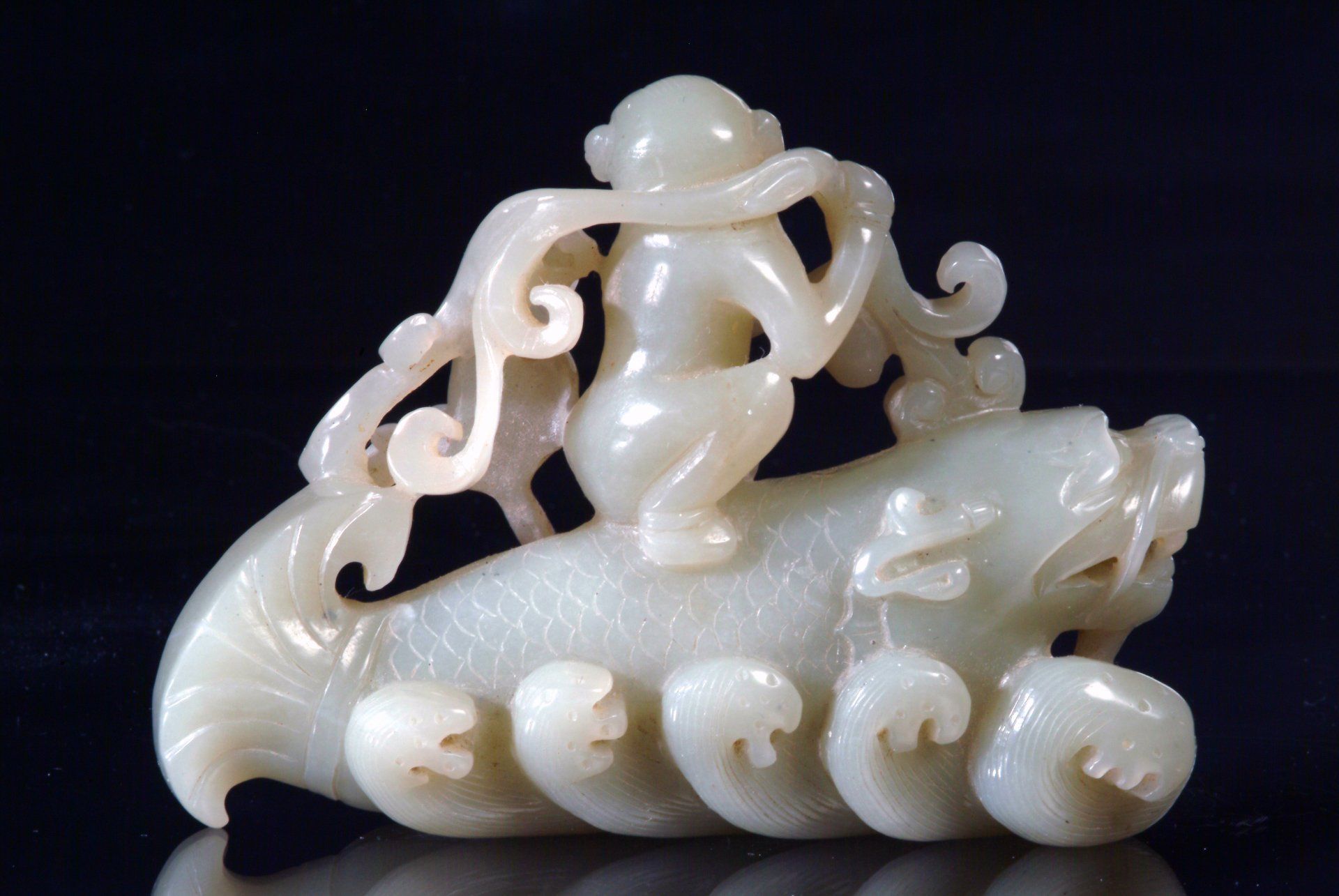 Figura de un pez mítico de jade blanco grisáceo de la dinastía Qing acompañado de un niño