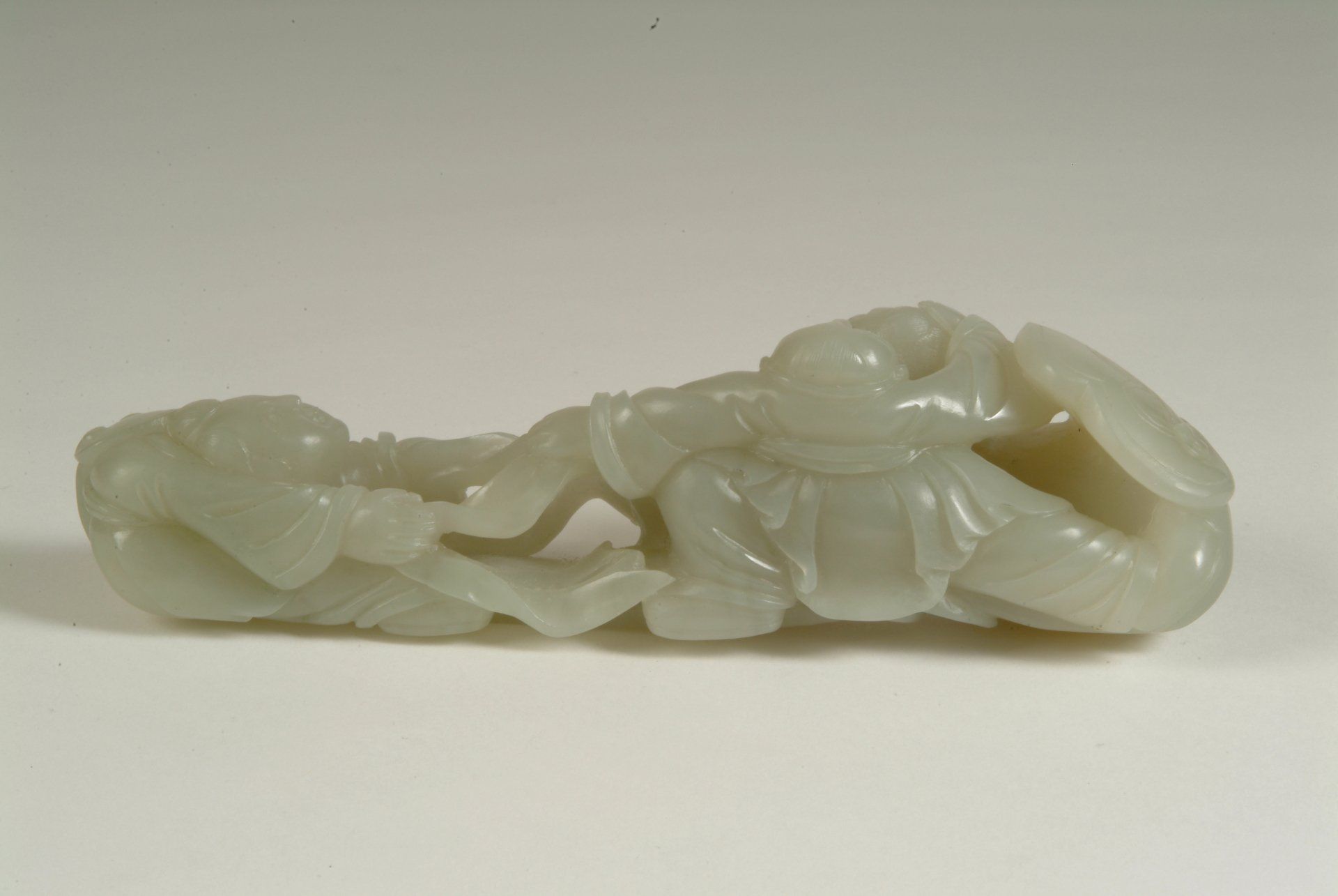 Cetro de jade blanco grisáceo con tres figuras juveniles de