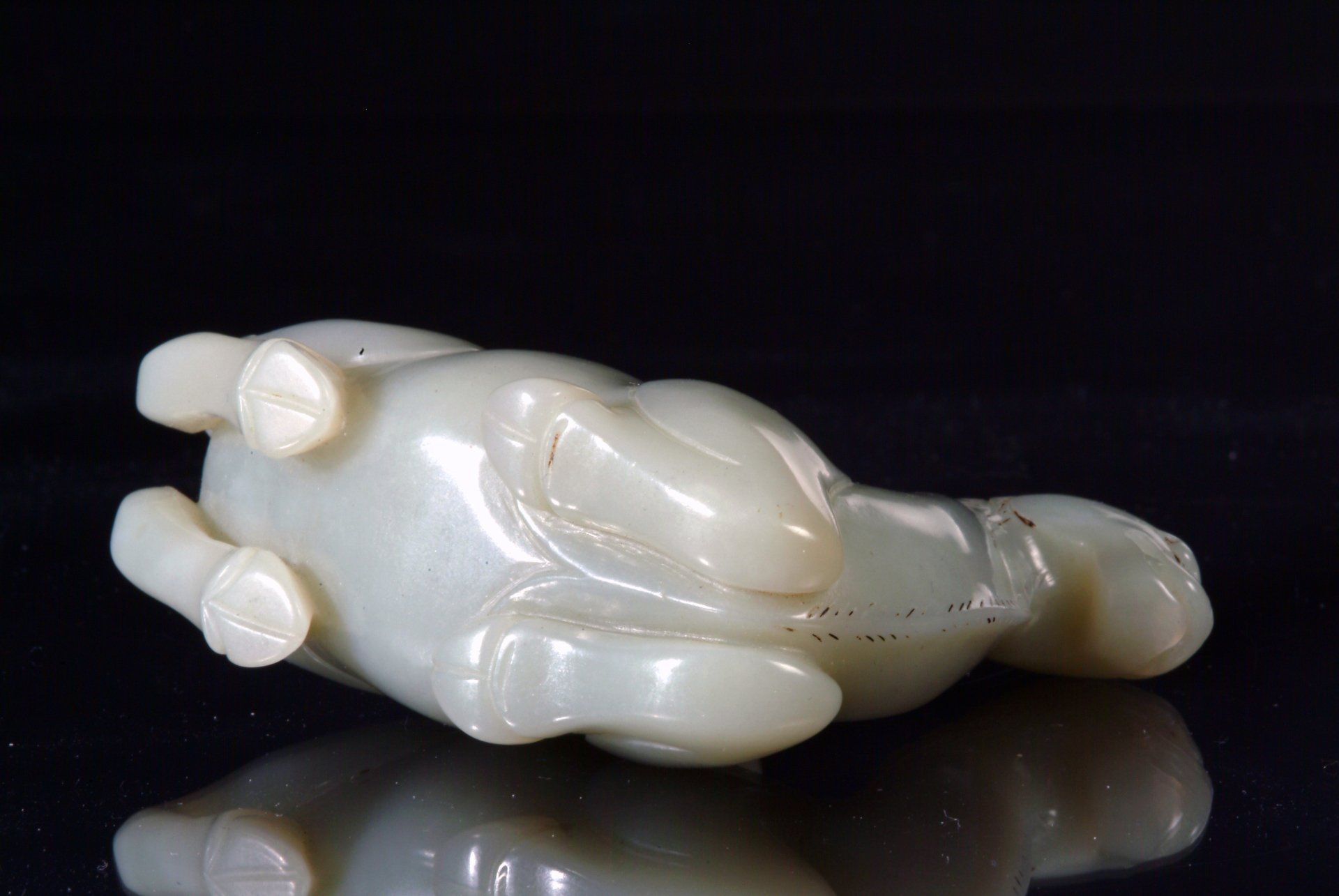 Esta representación de un pato, de la dinastía Qing, en jade blanco, intrincadamente tallada y acompañada de un tallo de trigo, presenta notables zonas de turbidez características de su antigüedad. La artesanía es un reflejo de la maestría de la época. La estatua mide aproximadamente 11,4 cm de largo.
