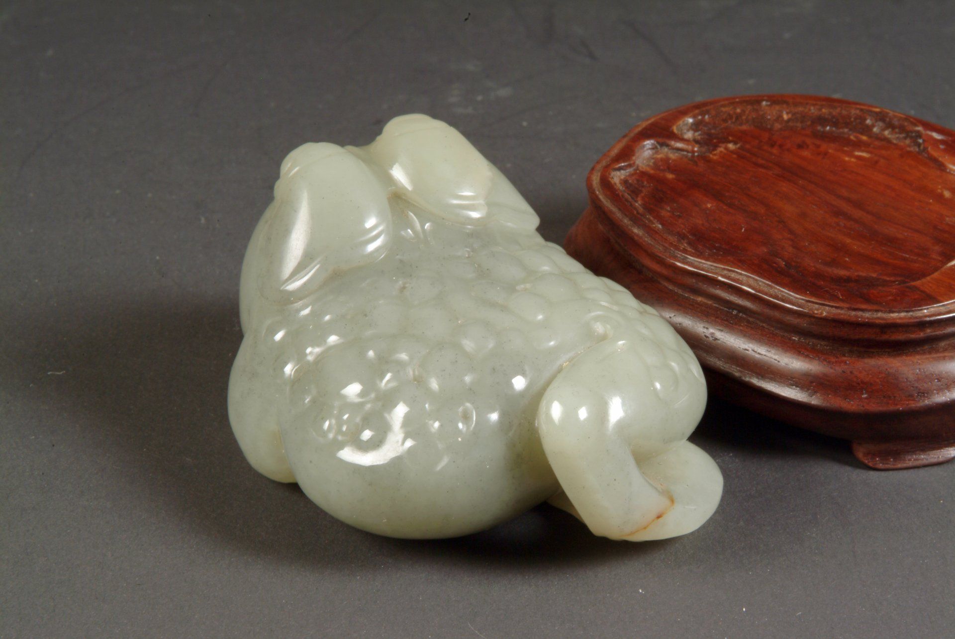 Esta estatua de rana de jade gris pálido translúcido de la dinastía Qing, finamente elaborada y con tres patas, ejemplifica el arte de su época. El jade exhibe una translucidez considerable, con vetas de intrincados patrones y sutiles inclusiones opacas que atestiguan su antigüedad. La estatua mide aproximadamente 7,6 cm de largo.