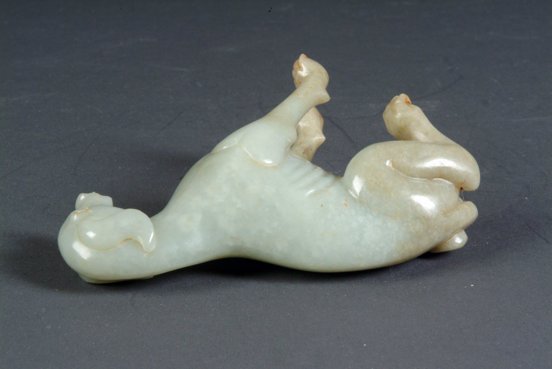 Esta escultura de jade gris verdoso, exquisitamente elaborada, de la dinastía Qing representa un caballo acompañado de un mono. Destaca por la inclusión de tonos marrones en el mono, y la maestría y las técnicas de tallado empleadas confirman inequívocamente su período de origen. Mide aproximadamente 9,5 cm de largo.