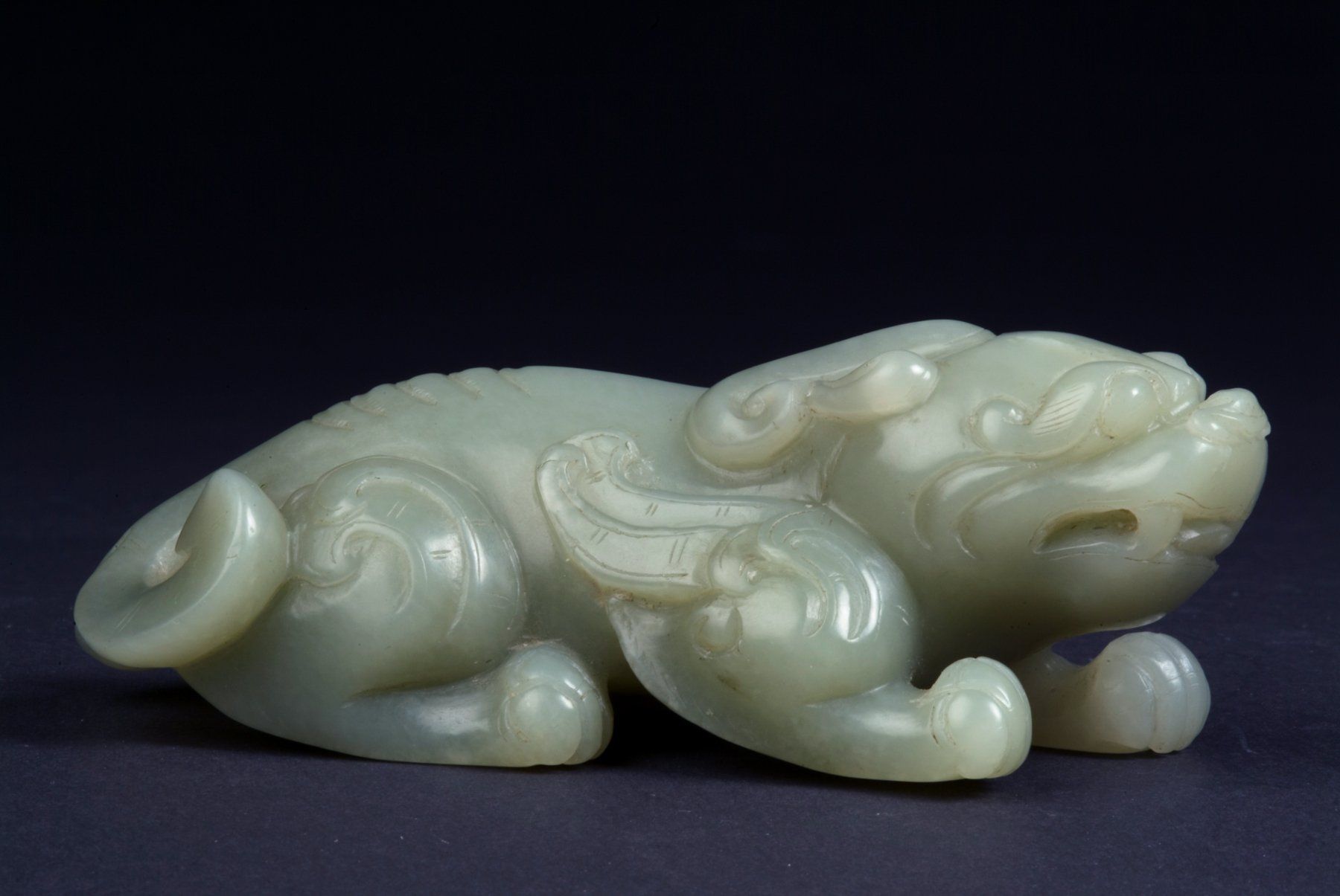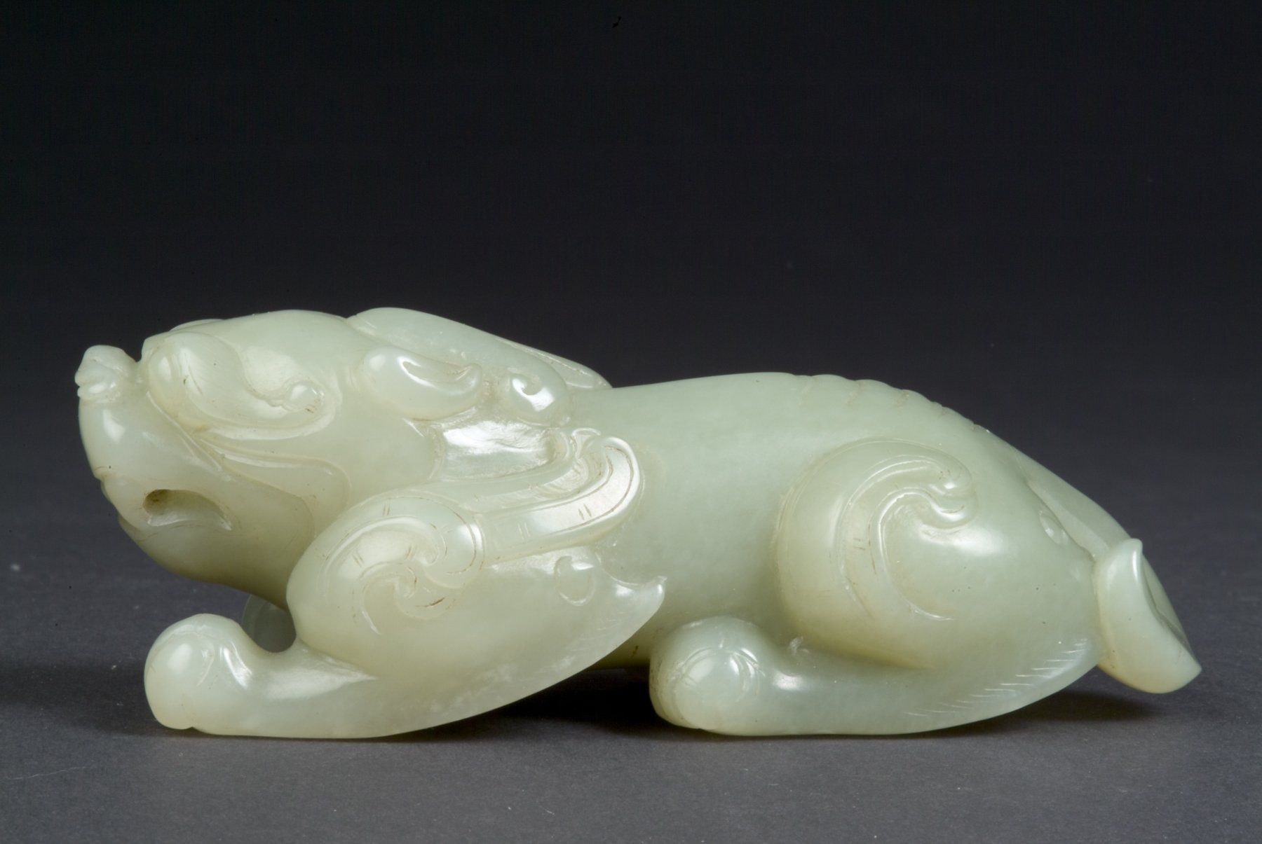 Esta escultura de jade celadón, finamente elaborada y que data de la dinastía Qing, representa una criatura alada mítica caracterizada por su cuerno y cola bifurcados. La estatua presenta pequeñas inclusiones opacas que atestiguan su antigüedad y autenticidad. Mide aproximadamente 11,4 cm de largo, lo que refleja la maestría artesanal de la época.