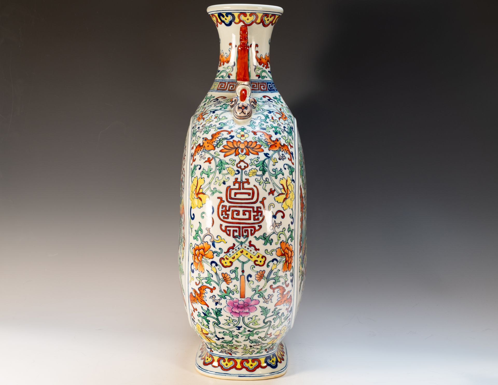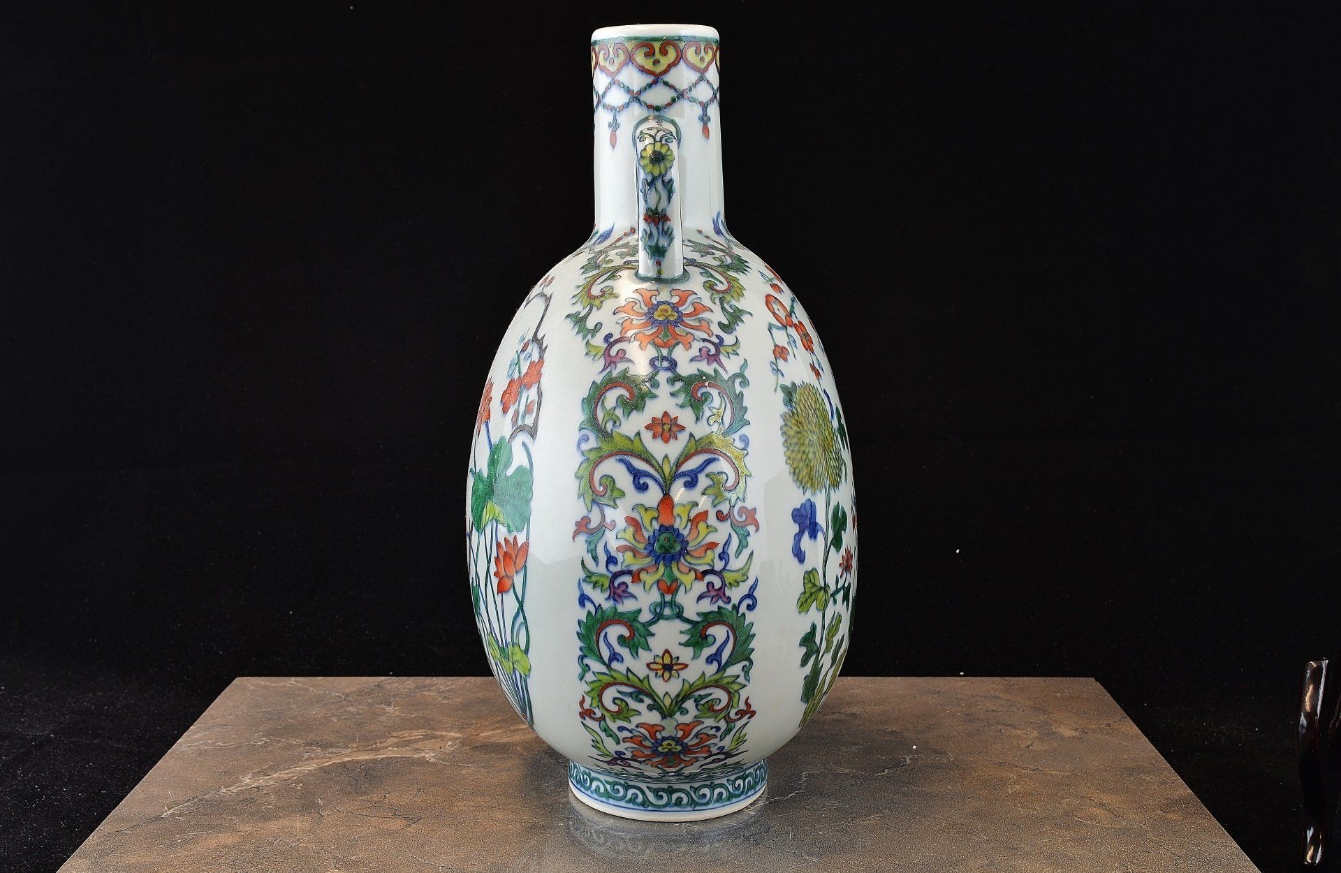 Un frasco lunar Doucai excepcionalmente grande del período Yongzheng de la dinastía Qing, que se distingue por su marca y su intrincado diseño, presenta motivos del Dragón y el Fénix entre nubes. El término "Doucai" significa "colores contrastantes", en referencia al uso de la paleta Familia Rosa, un estilo de esmalte notablemente inusual durante la era Yongzheng. Este frasco luce asas con elegantes diseños de peces voladores, mientras que su superficie está adornada con murciélagos, peonías en espiral y elementos florales. La base está marcada con el sello Yongzheng de seis caracteres en azul bajo cubierta. Además, la presencia de descascarillado en la galleta atestigua su importancia histórica y autenticidad. El frasco mide aproximadamente 57 cm de altura. ppjrs