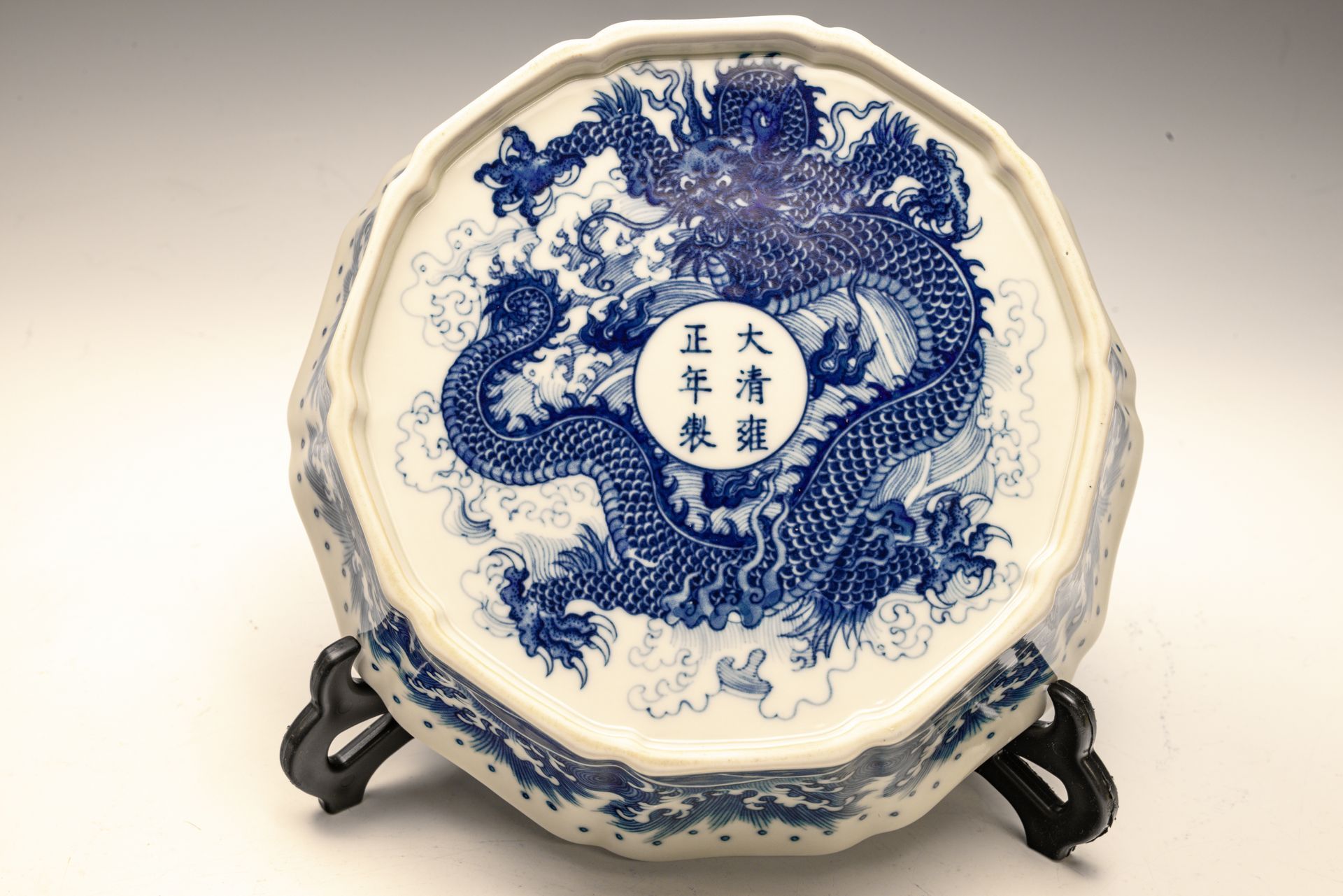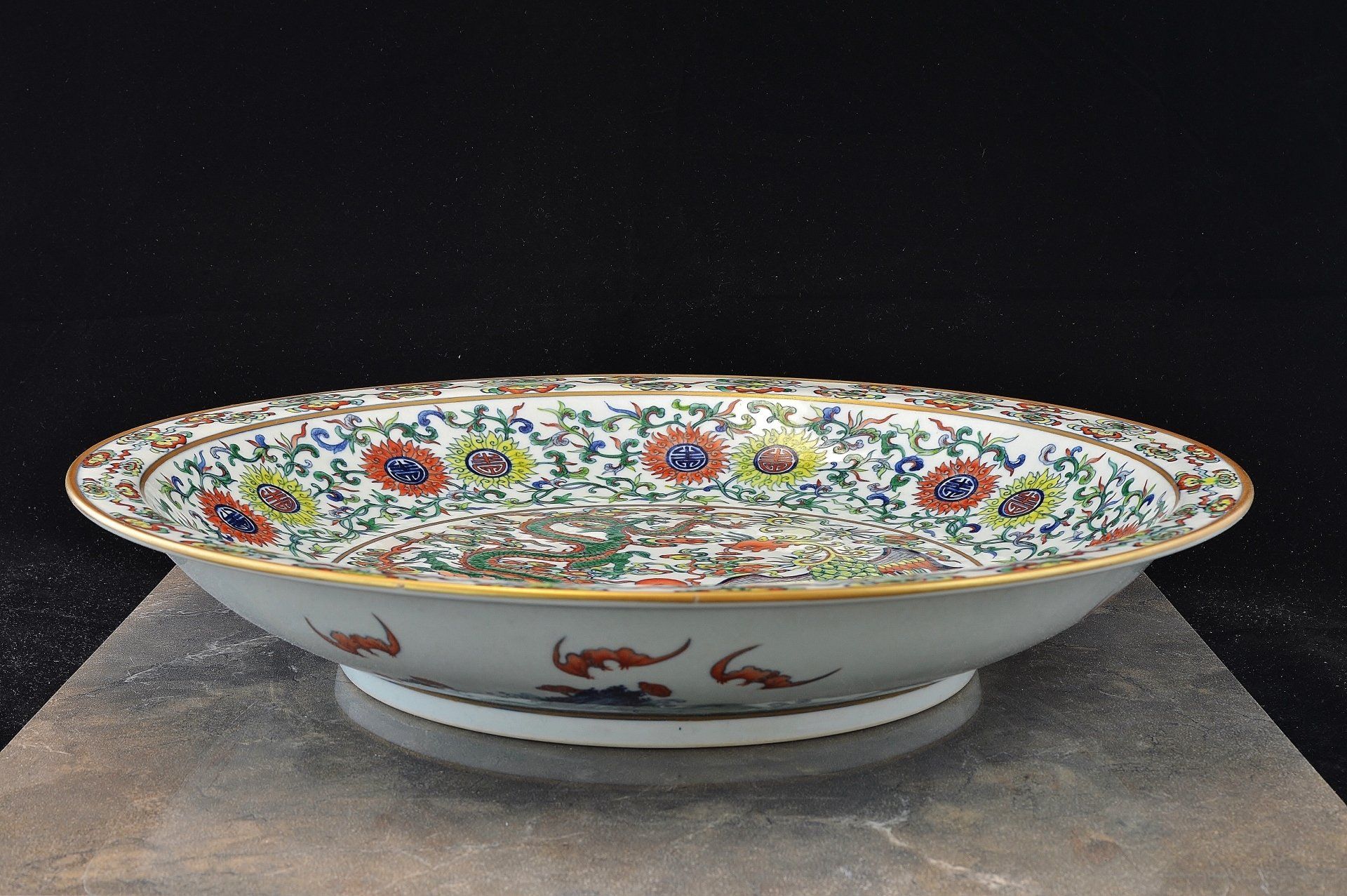 Este plato, marcado y elaborado durante el período Yongzheng de la dinastía Qing, presenta una refinada representación de un dragón y un fénix entre nubes arremolinadas. El término "doucai" se refiere a la técnica de contraste de colores, caracterizada por el uso de una distintiva paleta de esmaltes, predominante durante la era Yongzheng. La pieza presenta descascarillado en la galleta, lo que evidencia su antigüedad; mide aproximadamente 45 cm de diámetro. ppjrs