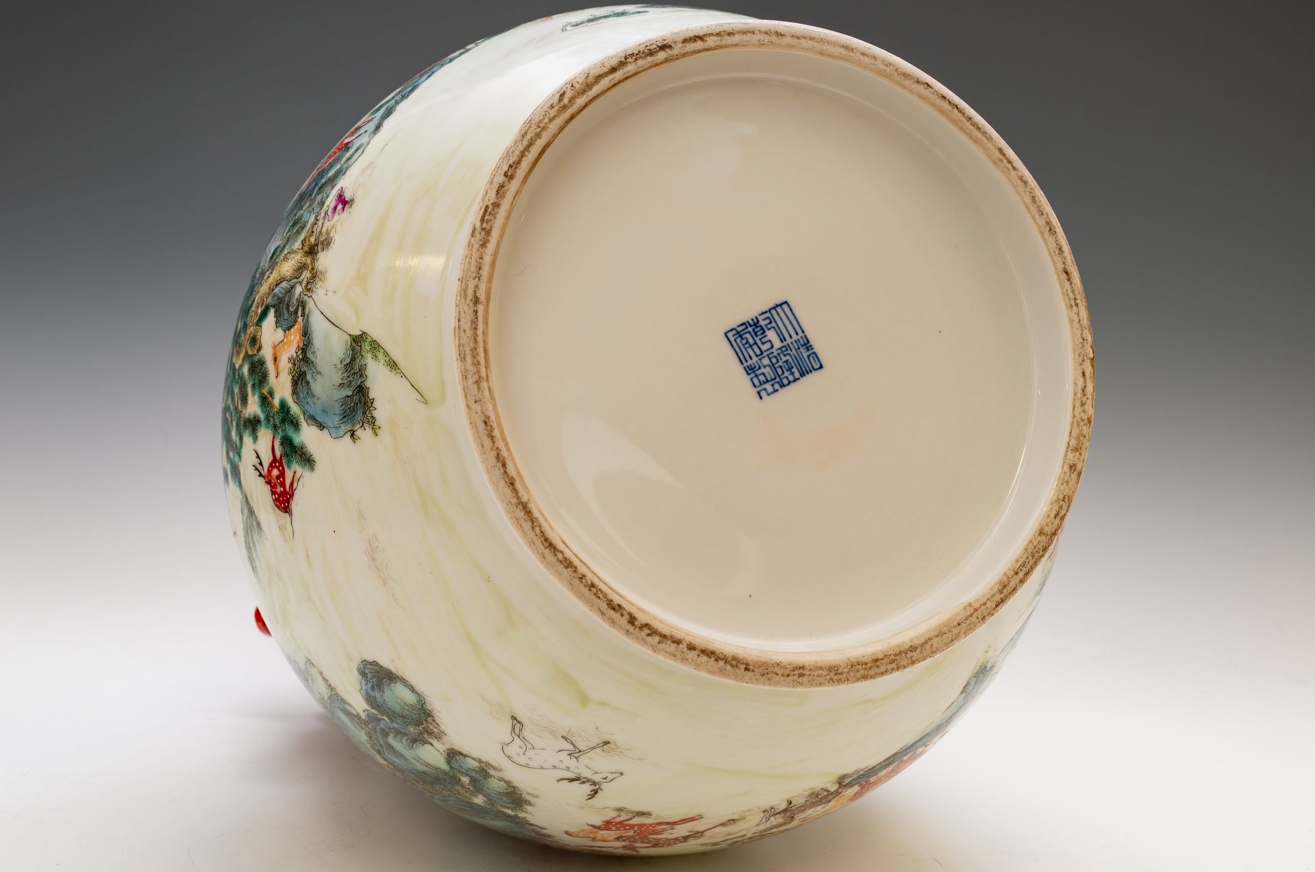 Jarrón de la dinastía Qing con cien grullas, acompañado de la marca del sello Qianlong y la designación del período.