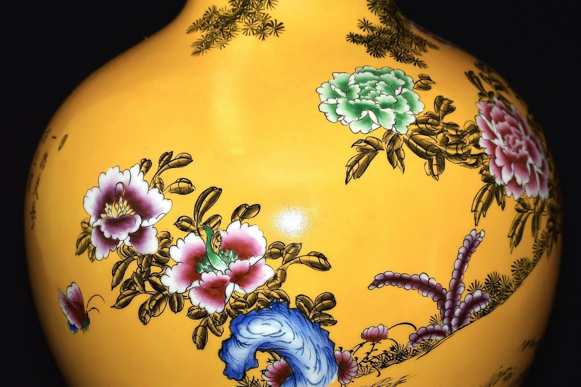 Este exquisito jarrón de la dinastía Qing presenta un fino fondo amarillo adornado con motivos intrincadamente grabados de mariposas, polillas, frutas y flores. Estos elementos están realizados en ricos y gruesos colores de esmalte, mientras que el resto del jarrón presenta una delicada aplicación de esmaltes finos. Con una hermosa forma globular, el jarrón está adornado con detalles meticulosamente pintados. La base ostenta el sello azul bajo cubierta de Qianlong, indicativo de su autenticidad. El descascarillado de la galleta evidencia su antigüedad, lo que corrobora aún más su procedencia y período, con una altura de 42 cm.