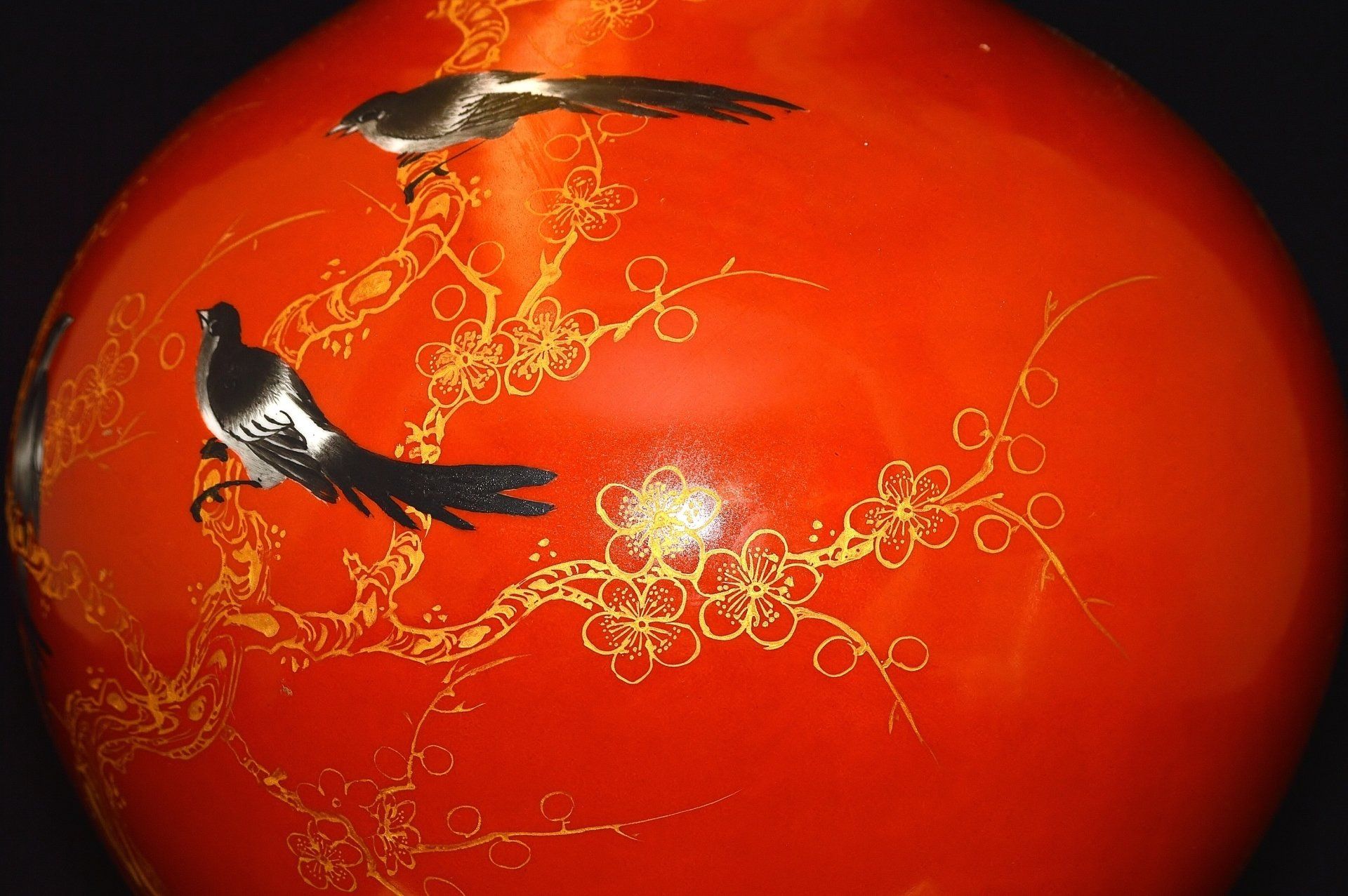 Jarrón ovoide de fondo rojo con marca y período Qianlong de la dinastía Qing decorado con motivos de aves