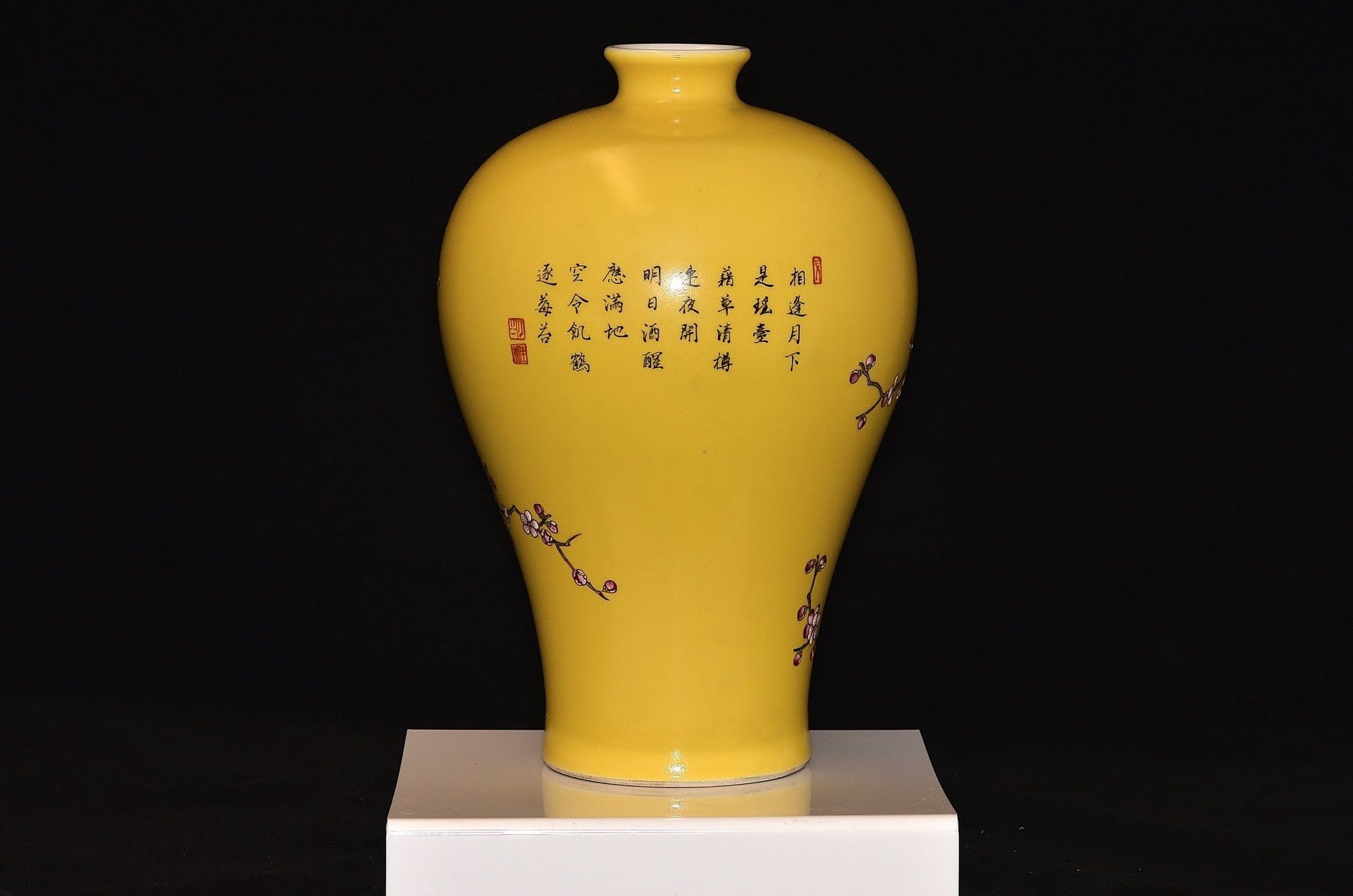 Obra maestra imperial de la dinastía Qing, Familia Rosa de fondo amarillo: Jarrón Meiping del período Qianlong con marca de sello