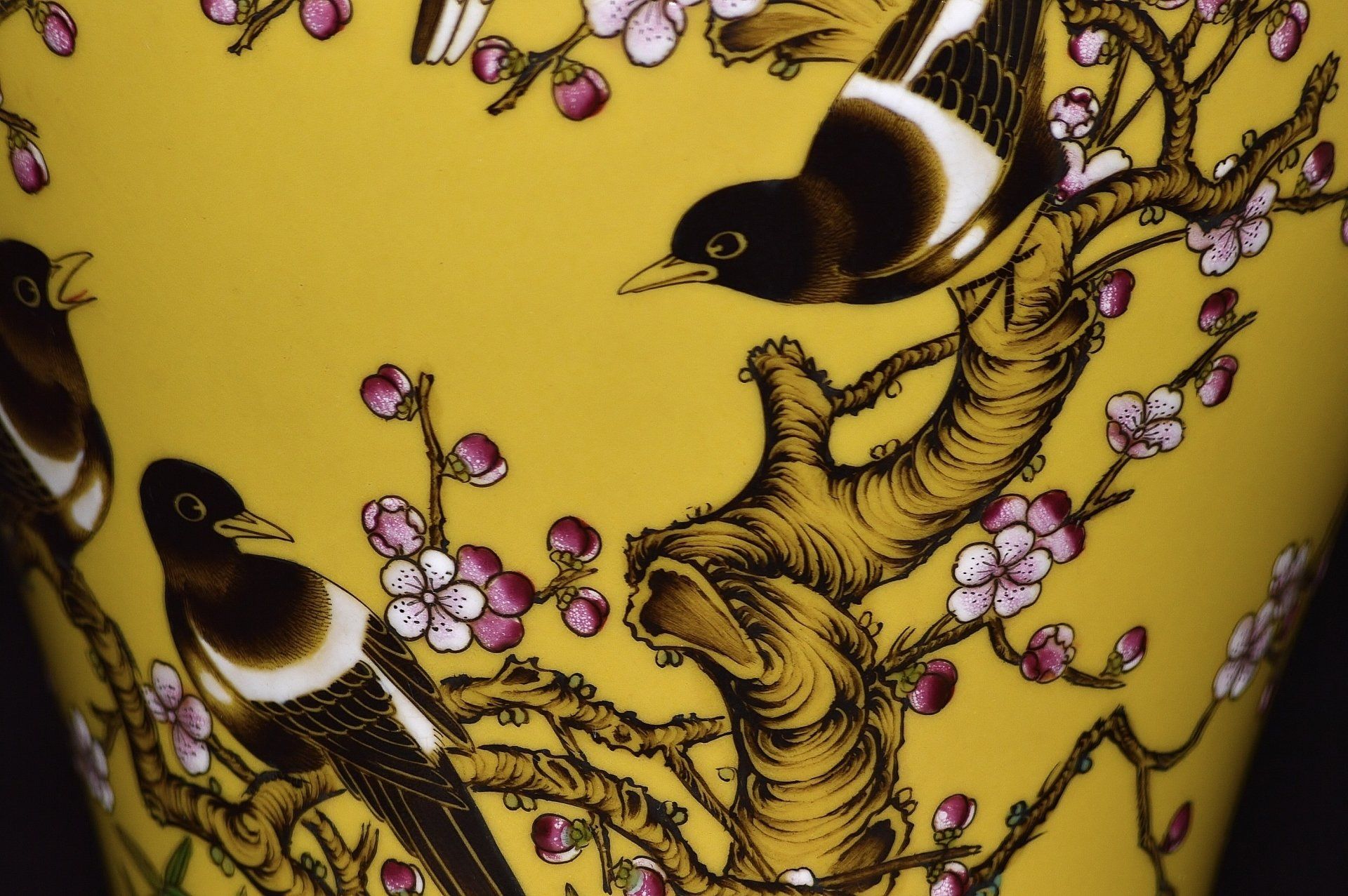 Este exquisito Jarrón Meiping Familia Rosa de la Dinastía Qing presenta un llamativo fondo amarillo adornado con ramas marrones de intrincada representación y flores de intensos tonos rosados, complementadas con cuatro motivos de urracas meticulosamente detallados. Para apreciar plenamente la habilidad y precisión del artista, recomendamos ampliar las fotografías adjuntas. El reverso del jarrón exhibe un poema elegantemente inscrito junto con tres sellos distintivos, lo que realza aún más su valor académico. El jarrón exhibe una forma elegante y presume de técnicas de pintura excepcionalmente finas, indicativas de los altos estándares característicos de la artesanía imperial. Cabe destacar que la base presenta el Sello Qianlong azul bajo cubierta, que se alinea a la perfección con los principales elementos decorativos del jarrón, un sello distintivo de las piezas imperiales Qianlong. Un ligero descascarillado en el material de galleta corrobora la antigüedad del jarrón. El jarrón mide aproximadamente 32 cm de alto y está reconocido como una pieza auténtica y específica de la época.