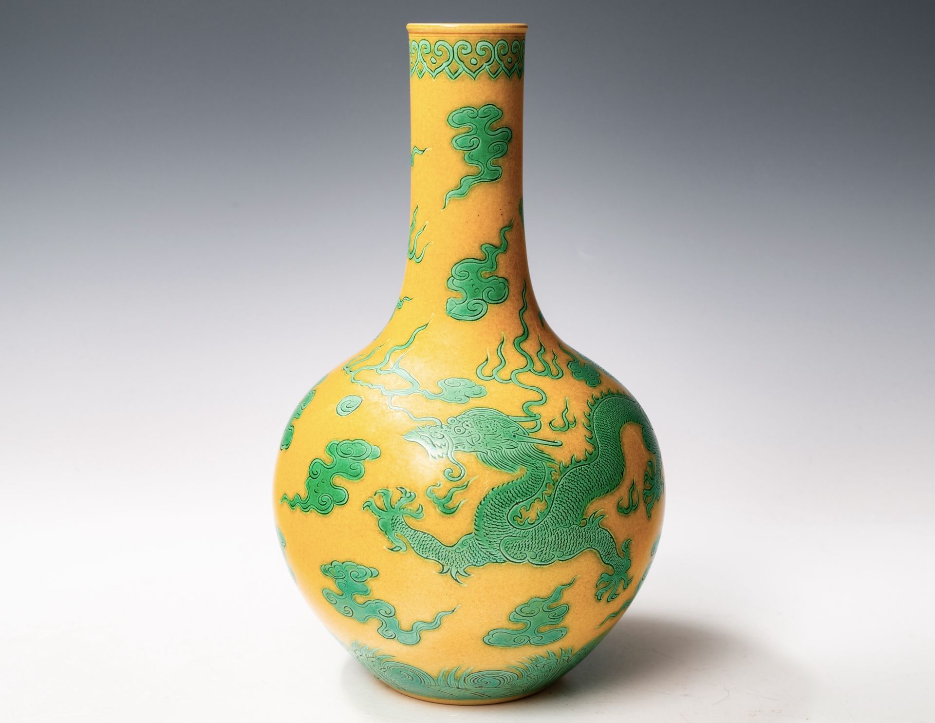 Jarrón de dragón inciso esmaltado en verde con fondo amarillo de la dinastía Qing, con marca y período imperial Qianlong