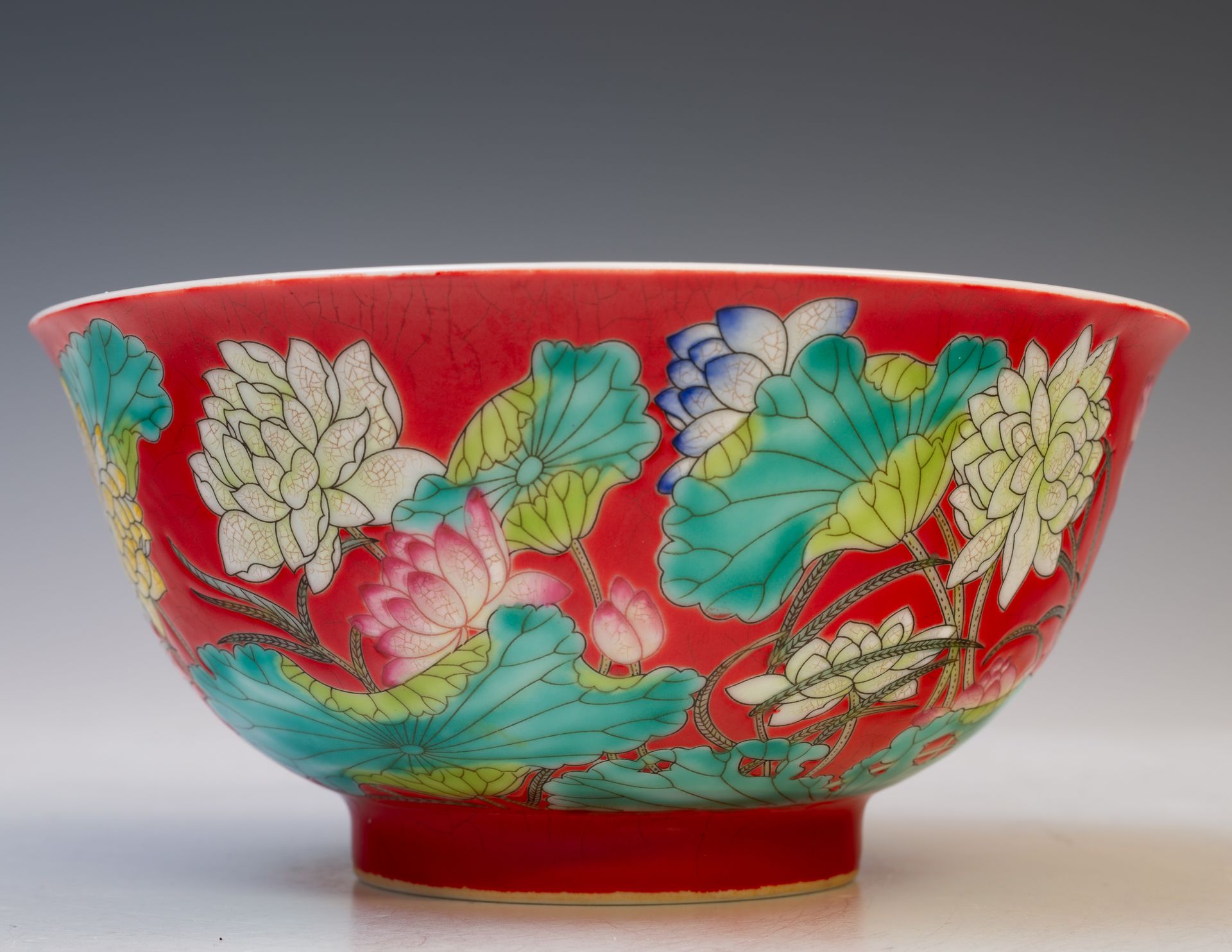 Cuenco de loto del período Kangxi con fondo rojo rubí y esmaltes Falangcai, que exhibe la marca Yuzhi de cuatro caracteres azules enmarcada en un cuadrado doble, dinastía imperial Qing.