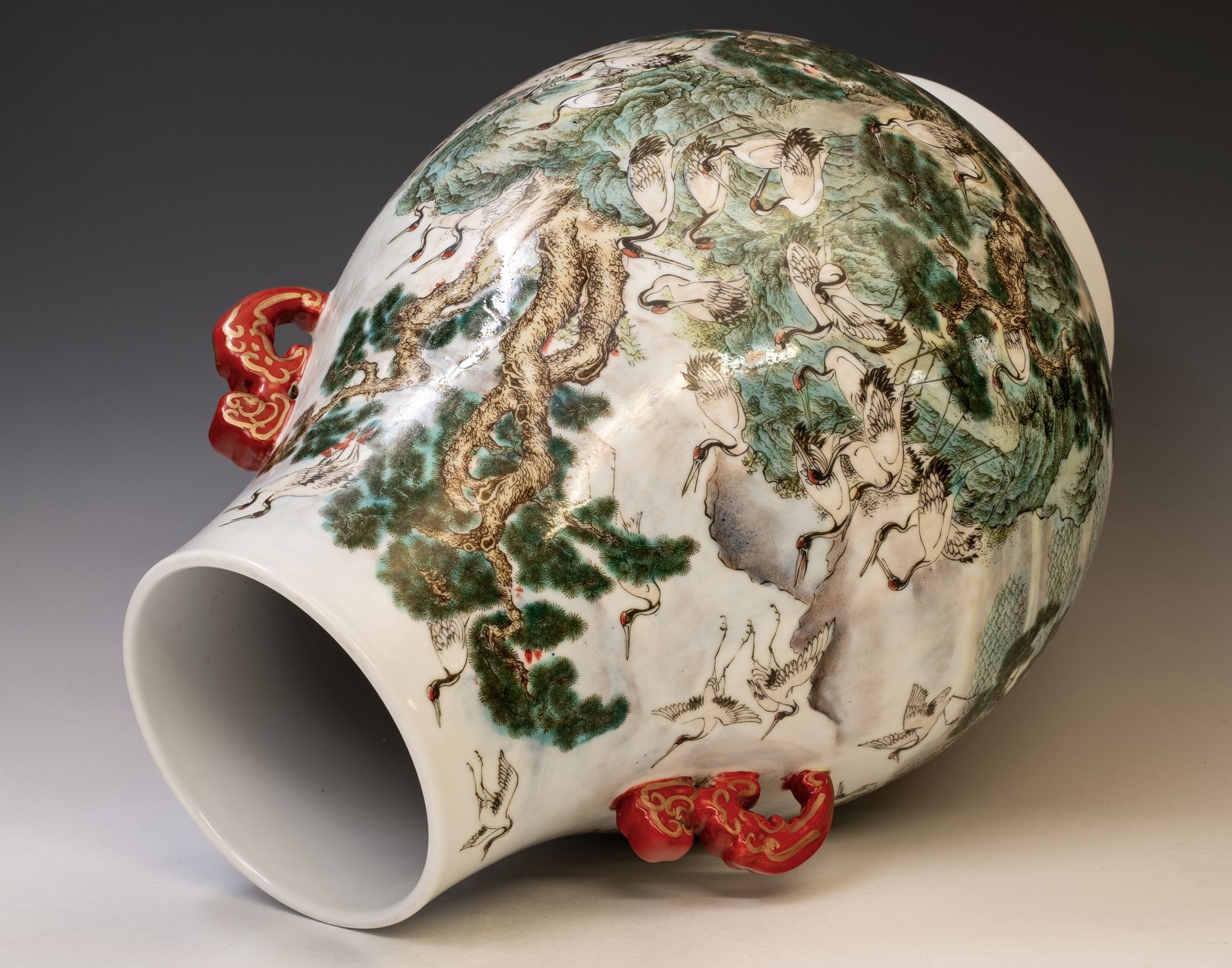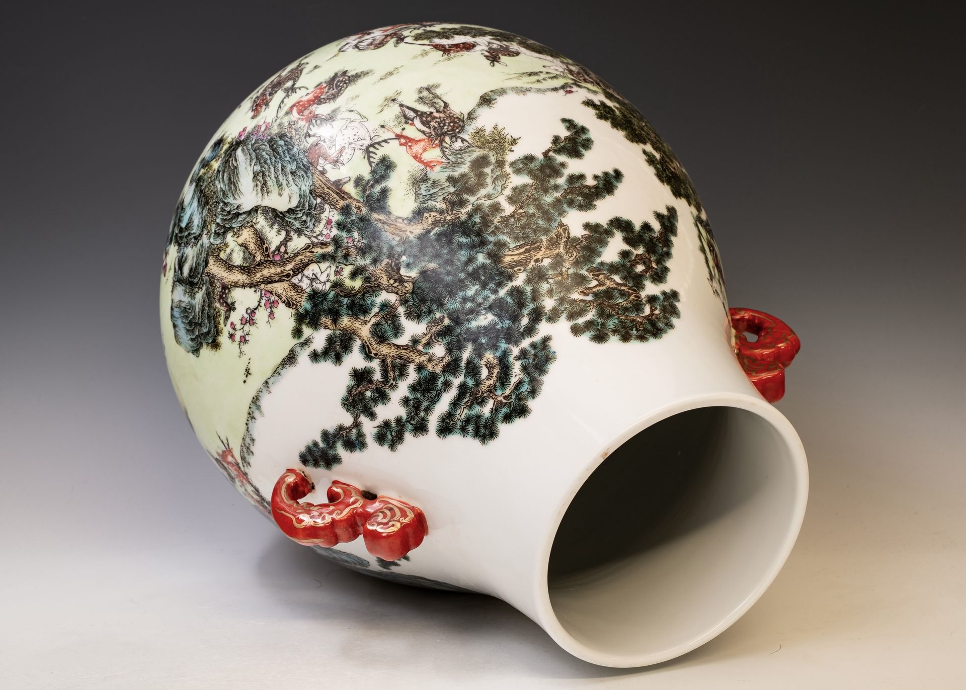 Presentamos con orgullo un excepcional y significativo jarrón de familia rosa, elaborado con maestría en forma de hu durante la dinastía Qing, concretamente en el período Qianlong (1736-1795). Este excepcional artefacto presenta un sello de seis caracteres en azul bajo cubierta, lo que atestigua su autenticidad e importancia histórica. El jarrón está adornado con un diseño intrincado y continuo que muestra una gran bandada de grullas sobre un fondo naturalista meticulosamente detallado. La composición demuestra una precisión notable, destacando los acantilados rocosos esmaltados, exquisitamente representados, enmarcados por imponentes picos montañosos, junto con grandes pinos retorcidos y ramas nudosas. Aproximadamente la mitad de las grullas aparecen posadas entre los pinos y los afloramientos rocosos, mientras que las demás aves planean con gracia. Un melocotón solitario, símbolo de longevidad, ocupa un lugar destacado, lo que enriquece aún más la complejidad temática de la pieza. Las demás grullas navegan con elegancia en las aguas, creando una escena natural tranquila y armoniosa. El color melocotón se aplicó selectivamente, lo que indica una decisión artística deliberada, posiblemente influenciada por la estética jesuita. Además, el jarrón está adornado con asas de dragón estilizadas, esmaltadas en ricos tonos rojo hierro y dorado, que ejemplifican la intrincada artesanía característica de la época. Un análisis de colecciones de museos, registros de subastas y fondos privados confirma que este jarrón se encuentra entre los mejores jarrones con grulla de su tipo a nivel mundial, con una impresionante altura de 48 cm. ppjrs