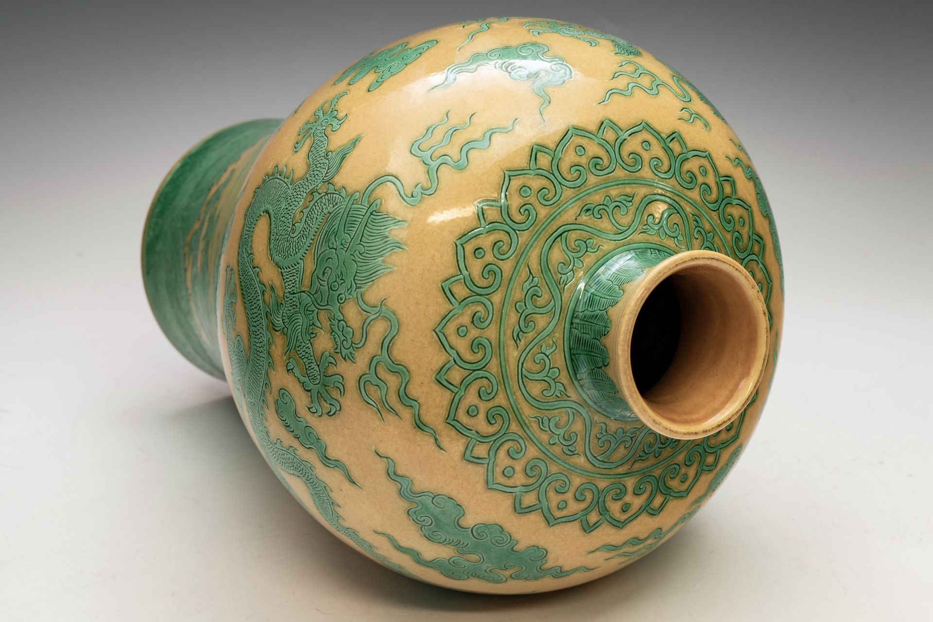 Jarrón Meiping de la dinastía Qing, con fondo amarillo y cinco dragones incisos esmaltados en verde.
