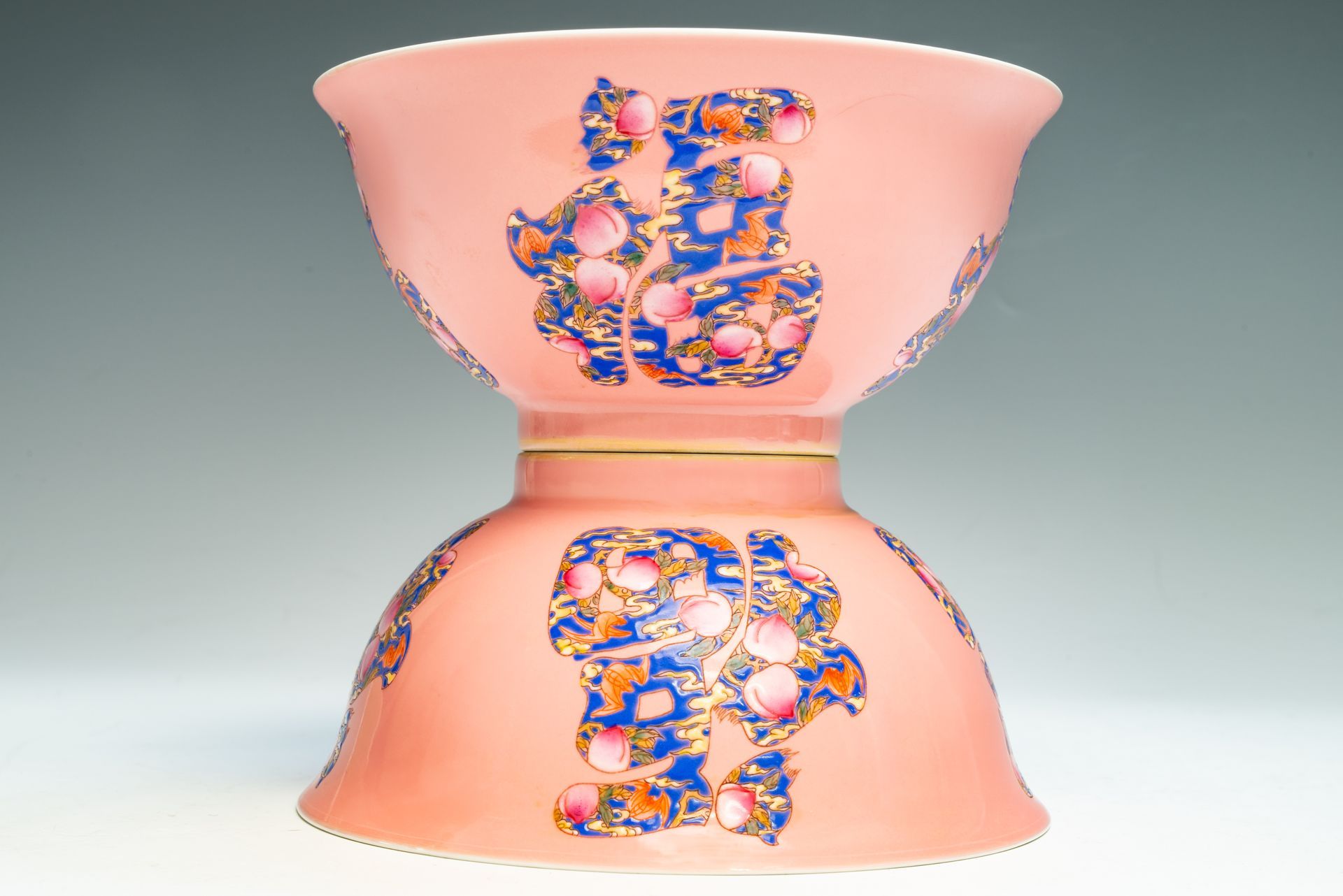 Par de cuencos Yongzheng de la dinastía imperial Qing con paleta Falangcai y marca dorada de cuatro caracteres de la época en forma de melocotón.