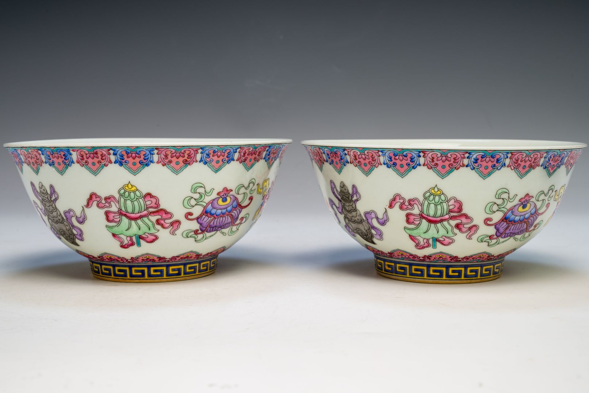 Par de cuencos del período imperial Yongzheng de la dinastía Qing, adornados con ocho símbolos budistas, con la marca Yuzhi de cuatro caracteres azules y el período en un diseño de doble cuadrado.