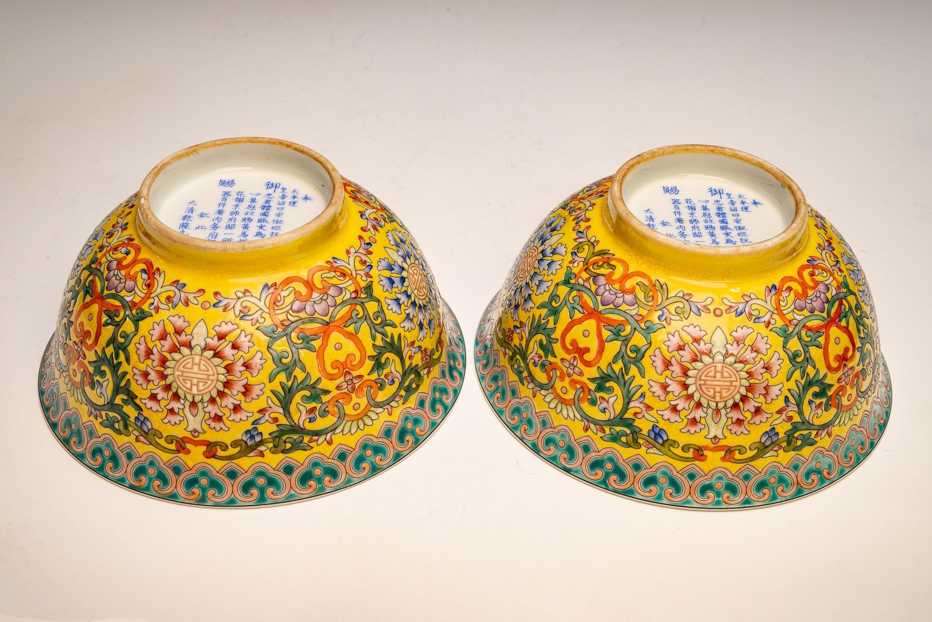 Par de cuencos de esmalte falangcai de color amarillo Kangxi de la dinastía imperial Qing, con una marca Yuzhi de cuatro caracteres de color rosa intenso en un cuadrado doble, que datan del período Kangxi.