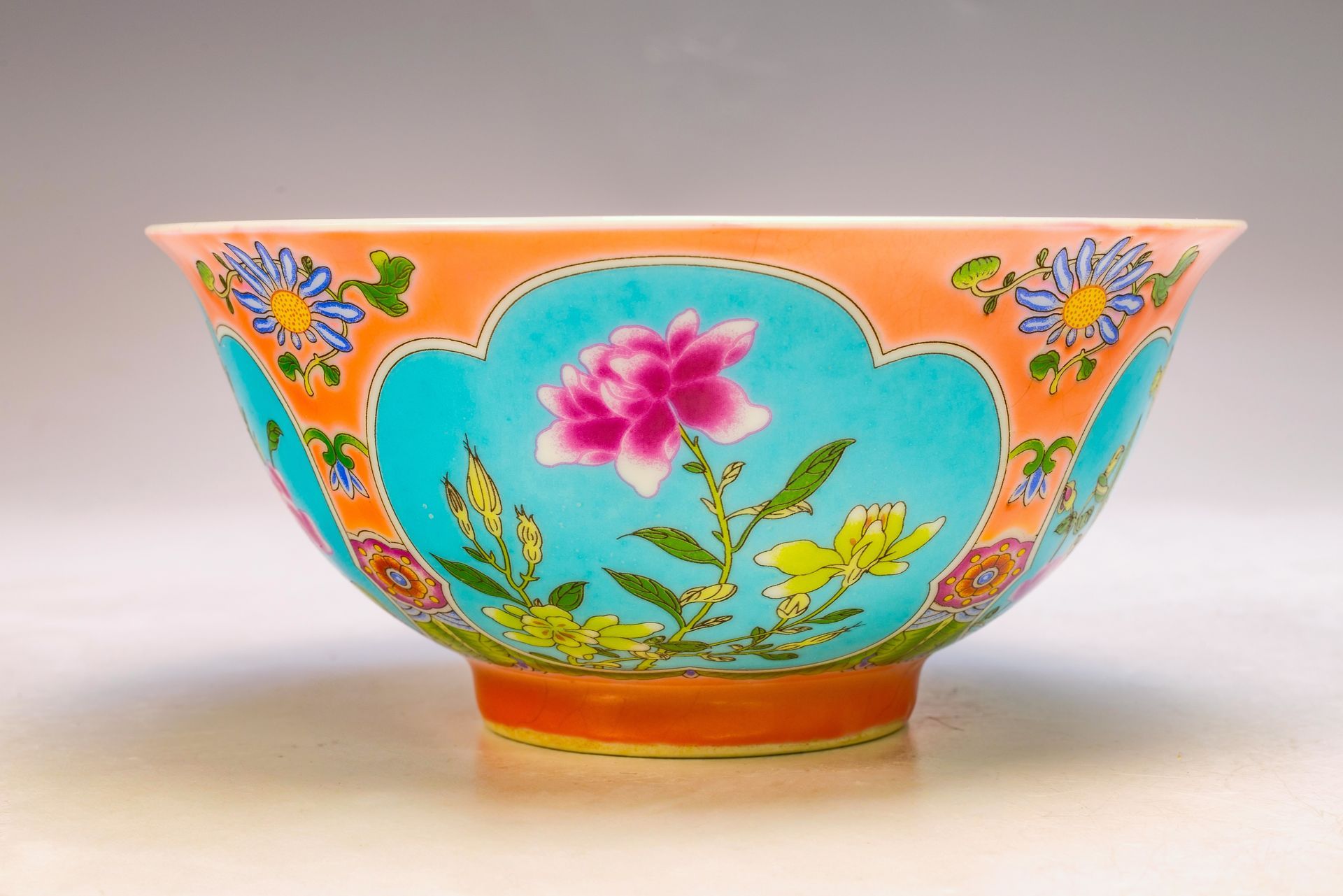 Cuencos de historia del período imperial Yongzheng de la dinastía Qing, decorados con paleta Falangcai e inscritos con la marca Yuzhi de cuatro caracteres dentro de cuadrados dobles.