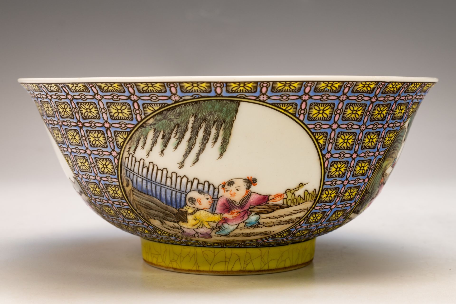 Niños del período Kangxi jugando con un cuenco decorado con falangcai que presenta la marca Yuzhi de cuatro caracteres azules en un cuadrado doble.