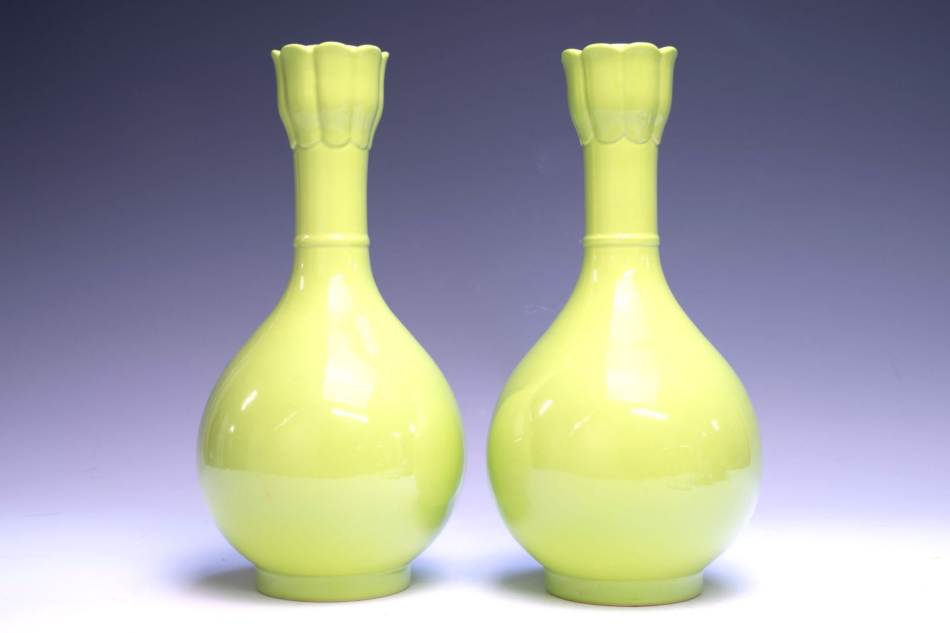 Importante par de jarrones con boca de ajo monocromos chartreuse de la dinastía Qing con sello imperial Yongzheng y raras marcas de la época.