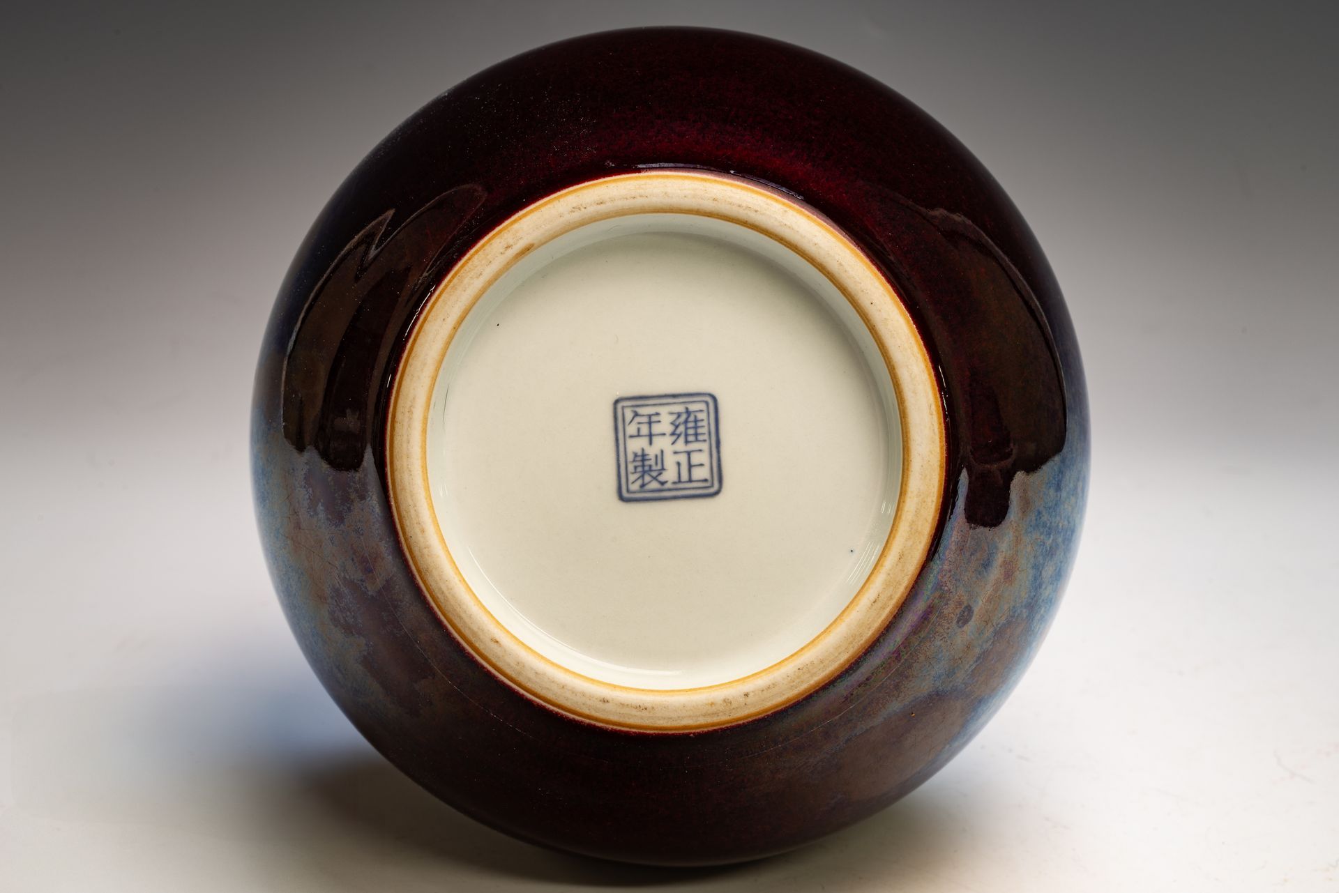 Este jarrón con forma de doble calabaza del período Yongzheng de la dinastía Qing presenta una excepcional elaboración, exhibiendo un impactante tono cereza negro. La pieza presenta buenas proporciones y demuestra técnicas de cerámica de alta calidad. Presenta una marca Yongzheng de cuatro caracteres en la base, indicativa de su período, y presenta marcas de cocción de hierro en el anillo del pie. Además, la presencia de descascarillado en el bizcocho sugiere su antigüedad. El jarrón mide aproximadamente 28 cm de altura. ppjrs