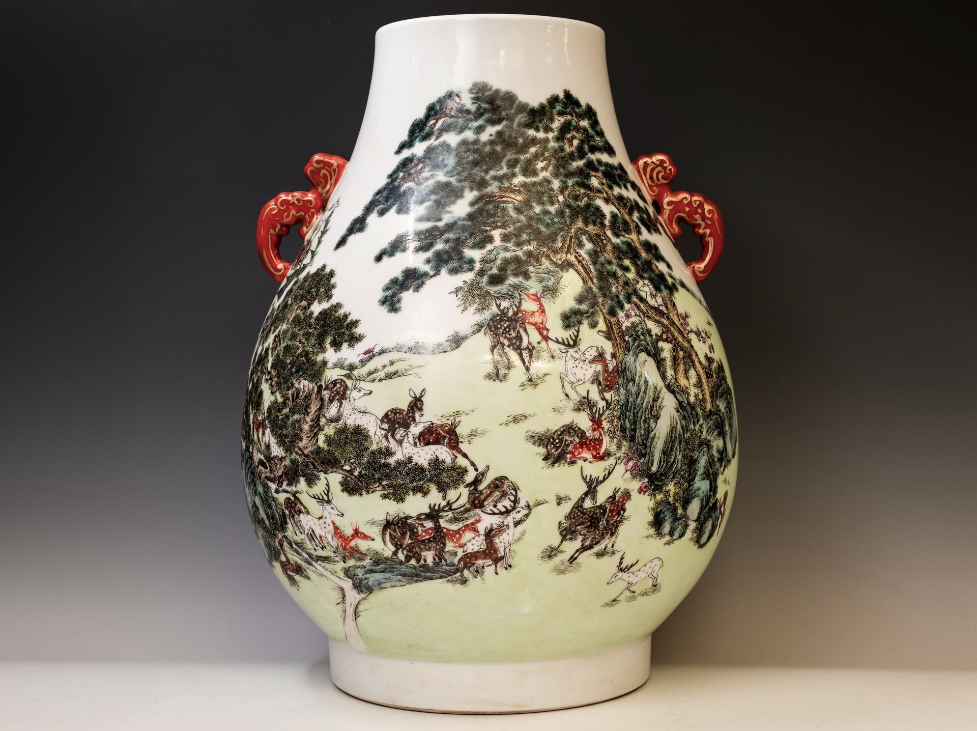 Este jarrón de forma hu de la Familia Rosa, elaborado con maestría durante la dinastía Qing, bajo el reinado de Qianlong, presenta un sello de seis caracteres en azul bajo cubierta, lo que indica su producción entre 1736 y 1795. Esta excepcional obra de arte presenta un motivo continuo de una manada de ciervos en un idílico paisaje natural. Los intrincados detalles ilustran a los ciervos realizando diversas actividades en un entorno montañoso, con terreno rocoso y pinos nudosos. Entre los elementos notables se incluyen ramas adornadas con melocotones, hongos lingzhi y un arroyo que desciende en cascada por la ladera. Las asas del jarrón presentan un elegante diseño en forma de cabezas de ciervo con astas. Esta notable pieza se alza en