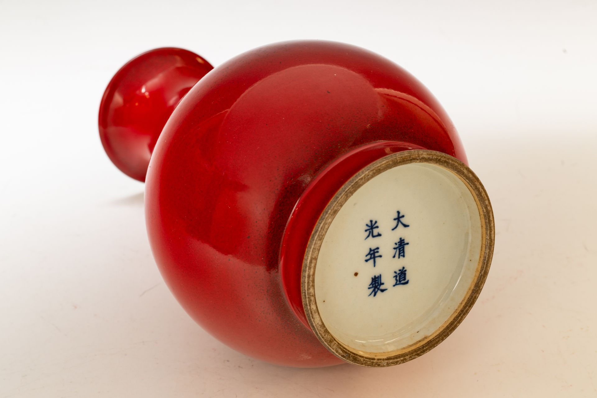 Este exquisito jarrón, originario de la dinastía Qing, y en concreto del período Daoguang, presenta un diseño en forma de pera. Su elaboración es experta y exhibe un tono rojo extraordinariamente intenso que resulta visualmente cautivador. El jarrón muestra signos de descascarillado en la galleta, indicativo de su antigüedad, y está marcado en la base con la marca Daoguang de seis caracteres. Mide aproximadamente 22,7 cm de altura. ppjrs