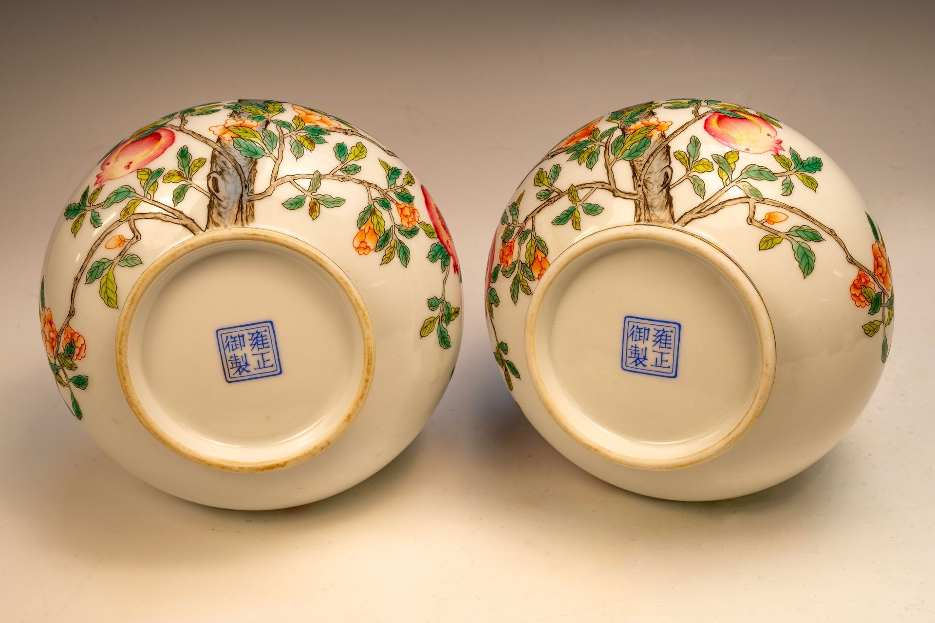 Jarrones del período imperial Yongzheng de la dinastía Qing: diseño en forma de pera con motivo de granado, realizado en esmaltes Falangcai y resaltado por una marca Yuzhi de cuatro caracteres encerrada en cuadrados dobles.