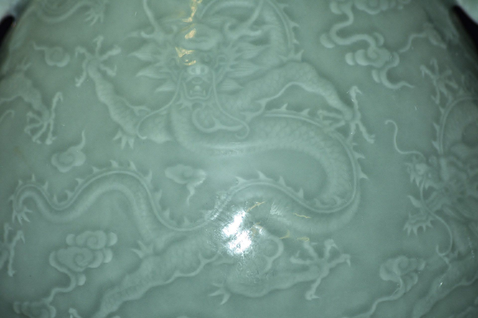 Este exquisito jarrón, marcado y datado en el período Qianlong, está elaborado en forma de Hu. Presenta cinco dragones de cinco garras, intrincadamente tallados, navegando entre nubes sobre un motivo acuático, lo que demuestra la excepcional maestría característica de esta época. El jarrón está adornado con un llamativo esmalte celadón y se complementa con dos asas de elegante diseño en forma de cabeza de ciervo. Además, luce la marca Qianlong, que armoniza con el prominente dragón central, sello distintivo de la cerámica Qianlong. El jarrón mide aproximadamente 32 cm de altura.