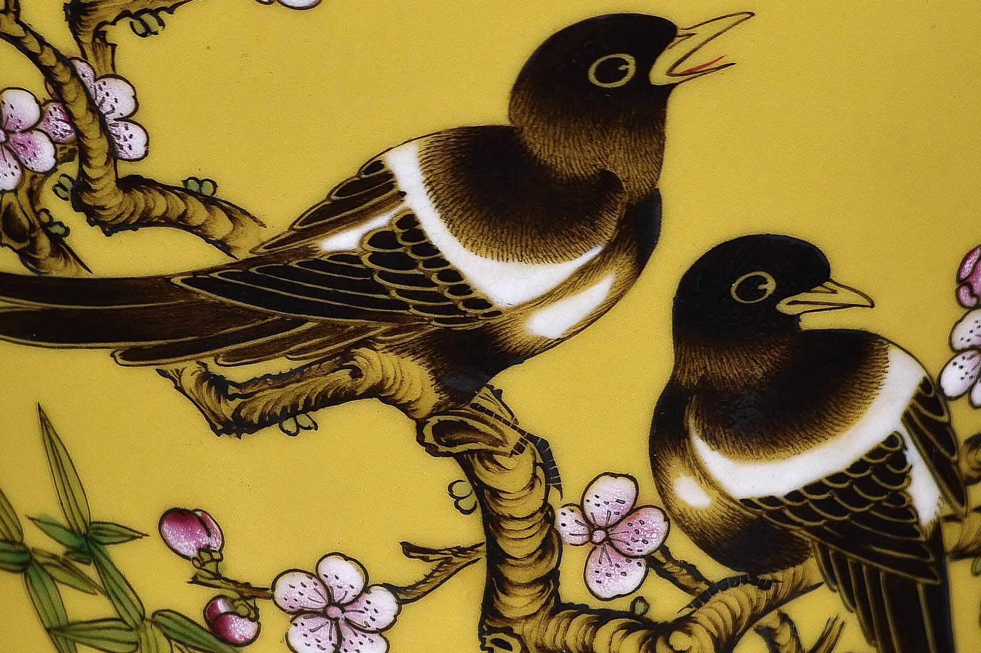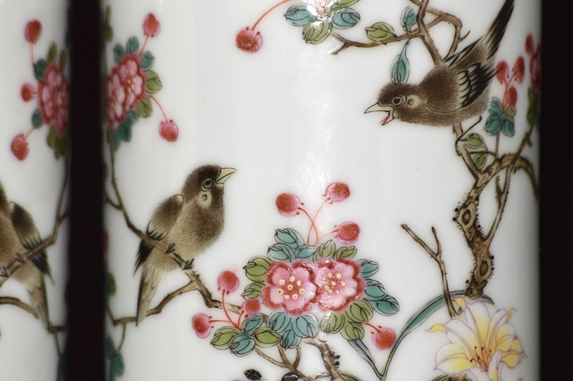 Estos exquisitos jarrones de esmalte Falangcai, notables por sus cuerpos de porcelana excepcionalmente finos, fueron elaborados en la Ciudad Prohibida de Pekín durante el período Yongzheng, concretamente entre 1723 y 1735. Los jarrones están adornados con intrincados diseños realizados en esmaltes Falangcai, y existen registros históricos que indican que el Emperador supervisó de cerca su producción. La destreza artística y la precisión requeridas para su creación son evidentes; un examen de los jarrones revela las características definitivas de una obra maestra de cerámica china. Se recomienda a los futuros coleccionistas que examinen atentamente las detalladas representaciones de hojas, flores y ramas. Un examen minucioso revelará la exquisita gradación de color y el sombreado que confieren equilibrio y profundidad a estos jarrones. Los coleccionistas deben distinguir entre piezas ordinarias y obras maestras excepcionales. Un análisis comparativo de la cerámica Qing a menudo revela que muchas fueron ejecutadas por artistas menos competentes, lo que resulta en apariencias planas con detalles y equilibrio insuficientes. Prestar atención meticulosa a estos elementos de color y sombreado es vital para discernir la calidad en el arte cerámico. La delicadeza de estos jarrones se ve realzada por su decoración, que incluye ramas, prunus en flor y motivos aviares. La paleta de colores de Yongzheng Falangcai es claramente reconocible. El paso del tiempo se aprecia en el descascarillado del bizcocho. Además, el reverso luce un poema inscrito junto con tres sellos. La base está marcada con la marca de cuatro caracteres de Yongzheng, realizada en esmalte azul dentro de cuadrados dobles, sello distintivo de los decoradores de Pekín. Cabe destacar que este par de jarrones no es idéntico, característico de las producciones de Yongzheng. Las aves representadas en estos jarrones exhiben una maestría incomparable, con las plumas meticulosamente ilustradas mediante más de mil pinceladas minúsculas ejecutadas con un pincel de un solo pelo, un detalle que solo se puede apreciar con una lupa. Un examen minucioso de las fotografías revelará la complejidad de los trazos, sobre todo teniendo en cuenta que los cuerpos de las aves miden tan solo 1,27 cm de ancho. La excepcional habilidad y control del artista son verdaderamente ejemplares. La calidad de estos jarrones es notable; su distinción puede verificarse mediante catálogos de subastas, textos de referencia y colecciones de museos para determinar si existen ejemplos documentados de jarrones Yongzheng Falangcai de calidad superior. Los jarrones miden aproximadamente 21,5 cm de altura.