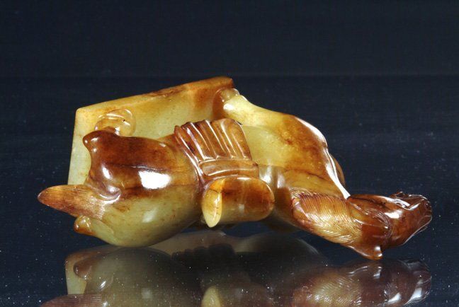 Esta estatua de caballo de jade blanco grisáceo con mono, meticulosamente elaborada, del período de las Seis Dinastías, presenta intrincados tallados y notables inclusiones rojizas, que indican su importancia histórica. La pieza mide aproximadamente 11,4 cm de largo.