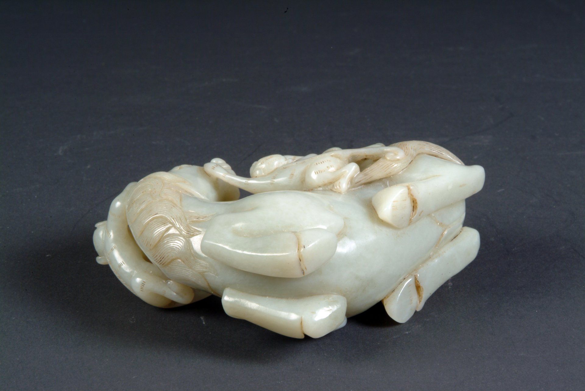 La estatua de carnero descansando con su cría en jade gris verdoso de las Seis Dinastías, que se distingue por notables inclusiones marrones que dan testimonio de su antigüedad, mide aproximadamente 3 1/4 pulgadas de largo.