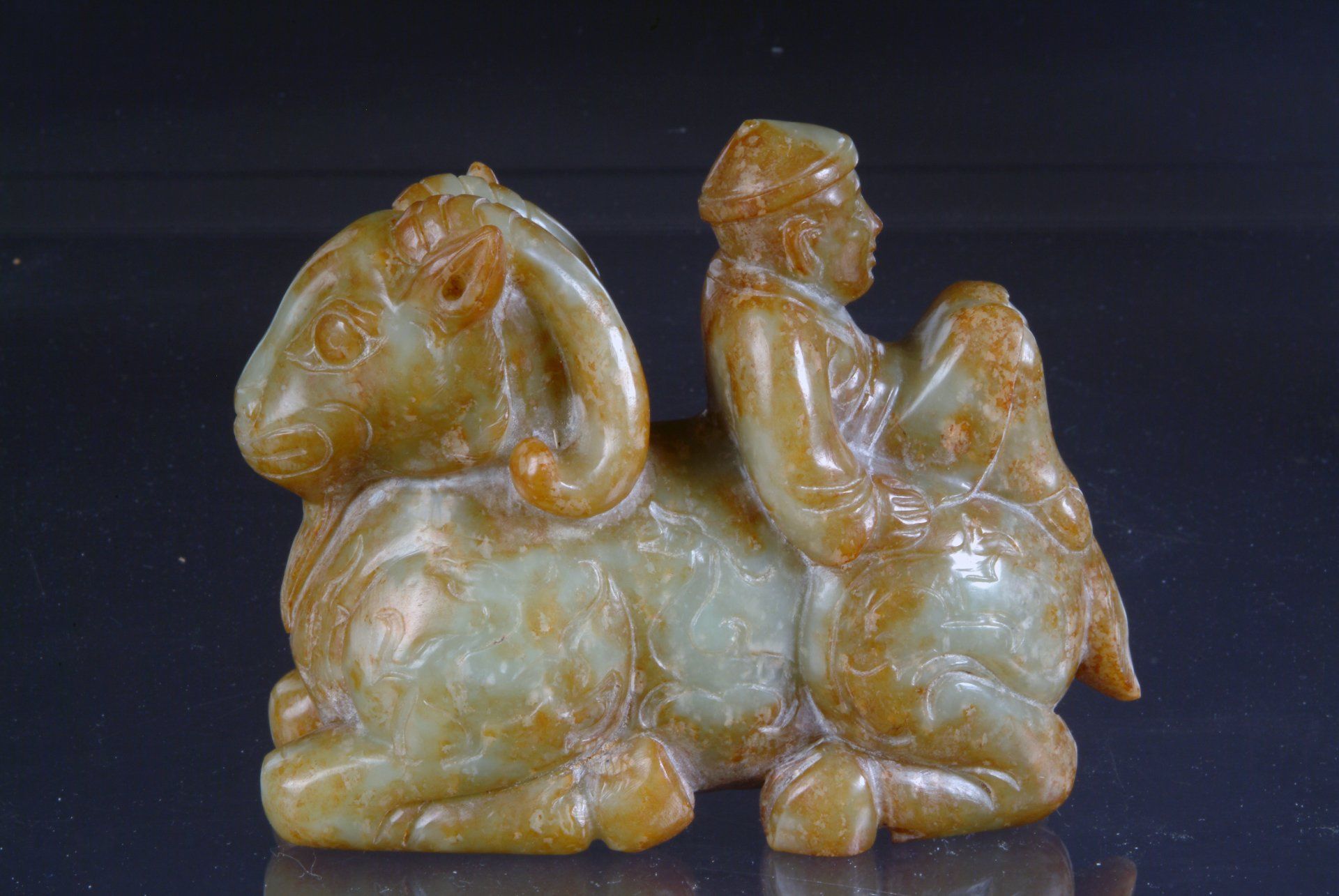 Esta estatua de jade celadón de las Seis Dinastías, finamente elaborada, representa un carnero en reposo con un jinete y presenta notables inclusiones rojizas. La complejidad de su tallado sirve para autenticar su antigüedad. La estatua mide