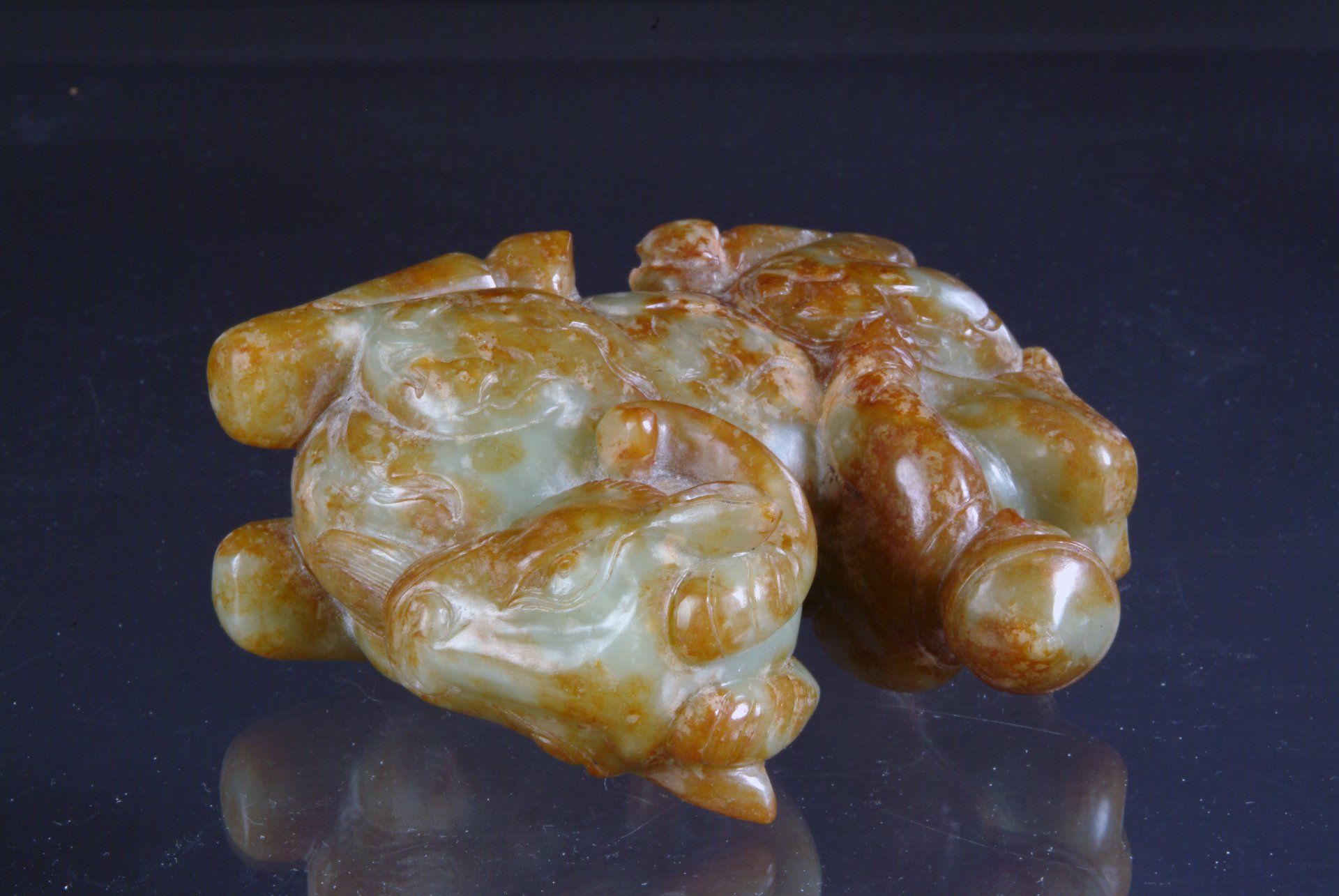Esta estatua de jade gris verdoso de las Seis Dinastías, finamente elaborada, presenta un diseño retorcido de un animal mítico, que se distingue por sus notables áreas con inclusiones marrones y rojizas. La complejidad del tallado confirma su procedencia histórica. La estatua mide aproximadamente 11,4 cm de largo.