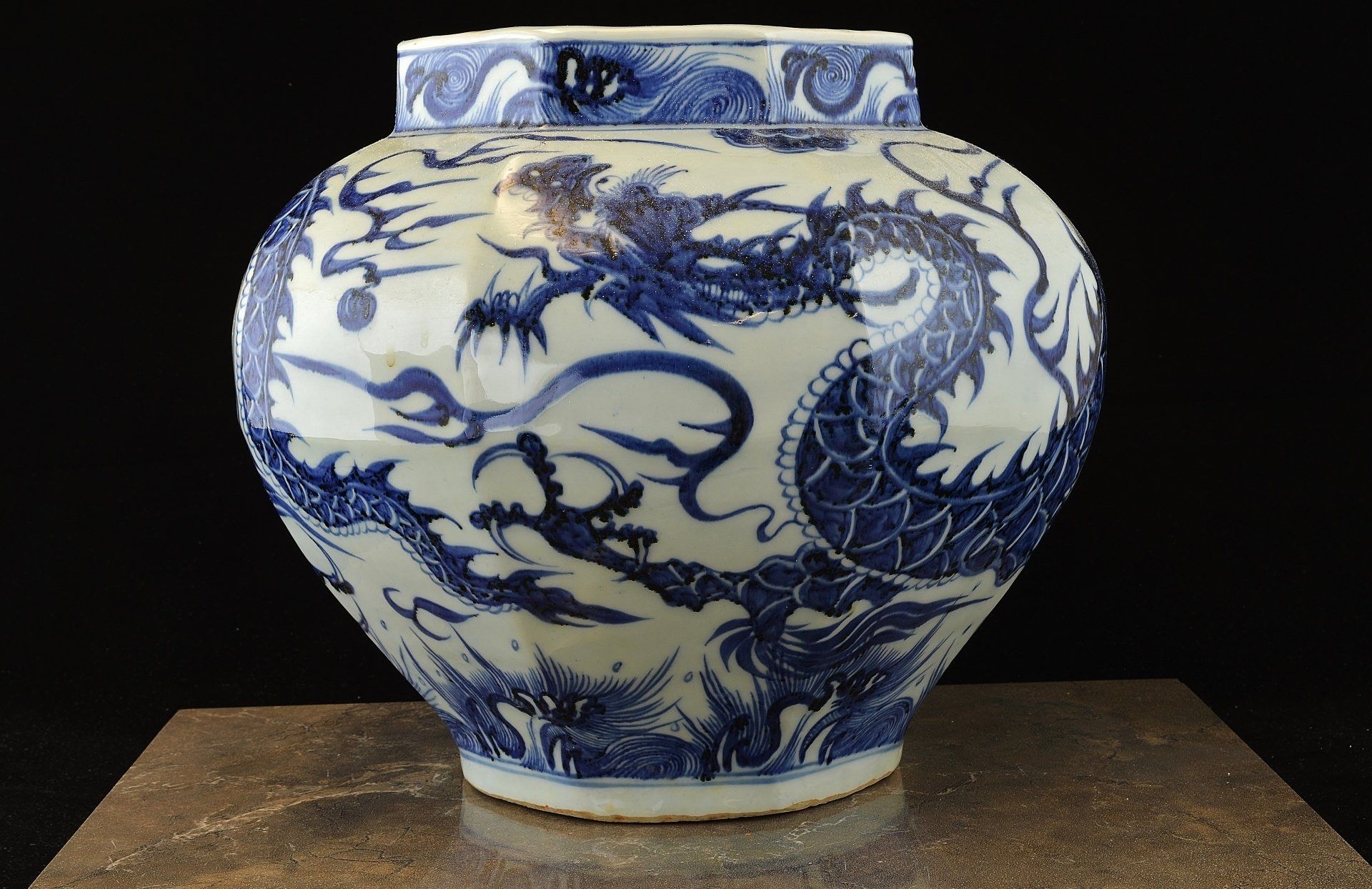 Jarrón azul y blanco de la dinastía Yuan con un dragón persiguiéndolo