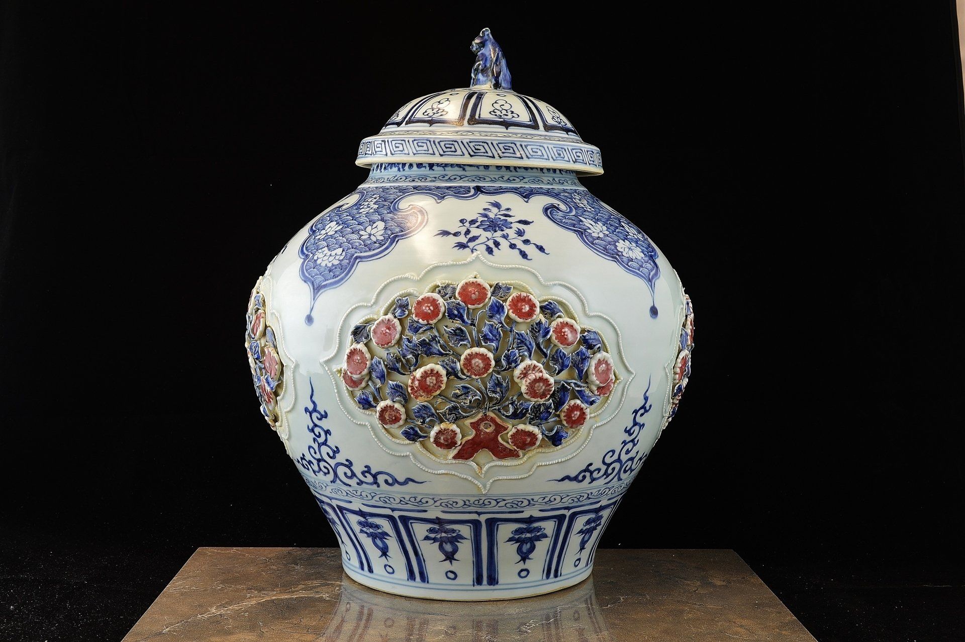 Jarrón azul, blanco y rojo de la dinastía Yuan: uno de un par con cuatro paneles de diseños florales y de follaje aplicados.