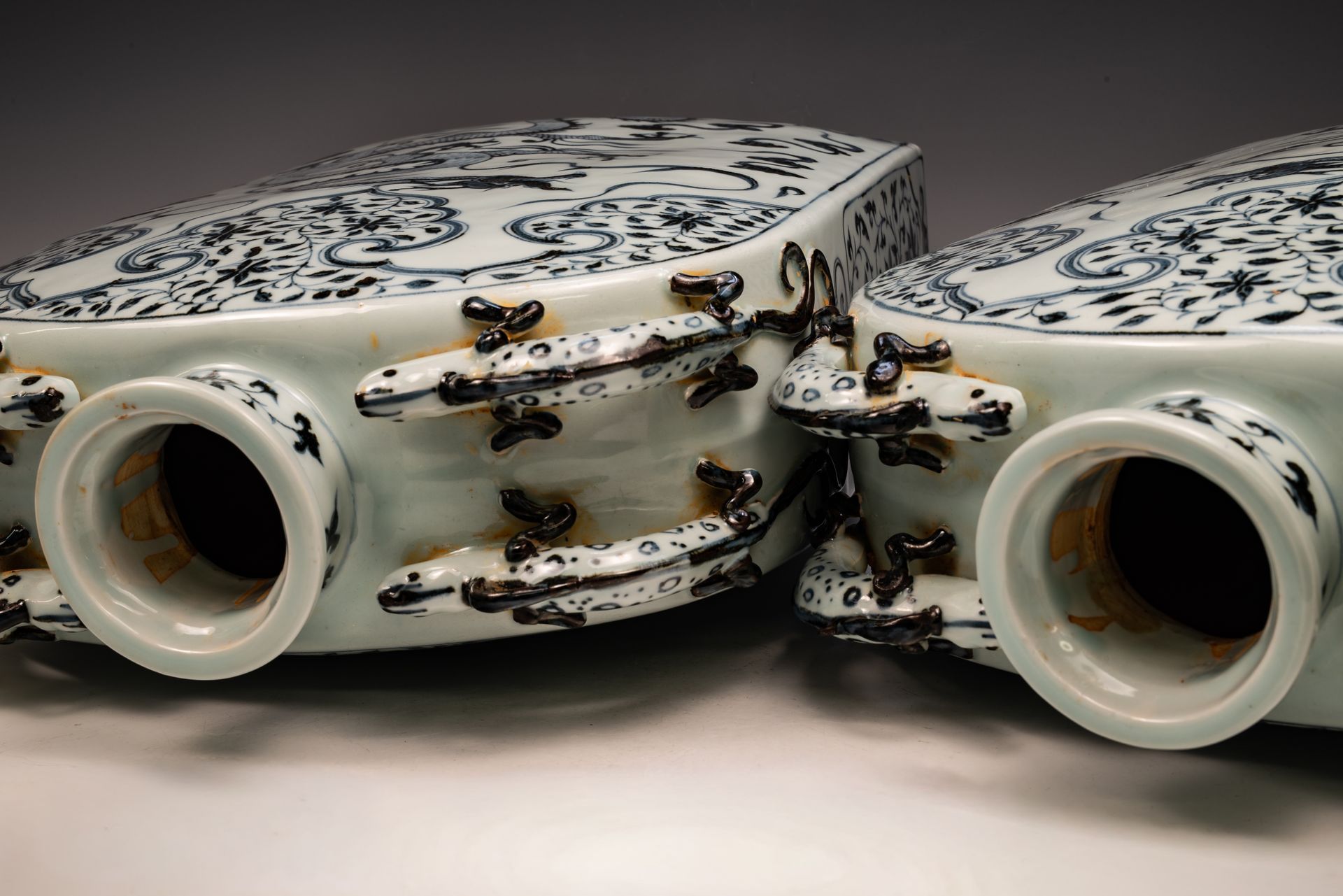 **Par de frascos de la dinastía Yuan con prominentes dragones azules y blancos entre nubes y agua, con peonías colgantes y cuatro asas de dragón ornamentadas** Estos exquisitos frascos representan las avanzadas técnicas de pintura características de la dinastía Yuan. Han sido elaborados meticulosamente con cobalto azul samali importado, que destaca por su distintivo tono negruzco. La concentración de cobalto suele producir un efecto único de amontonamiento, que da lugar a manchas negras o reflejos plateados al interactuar con la superficie del vidriado. Esta característica es un indicador vital de la autenticidad de los frascos, ya que no se ha importado cobalto en más de cinco siglos. Además, la presencia de motas negras y descamación en el bizcocho corrobora su considerable antigüedad. Cada frasco mide aproximadamente 40 cm de alto. ppjrs