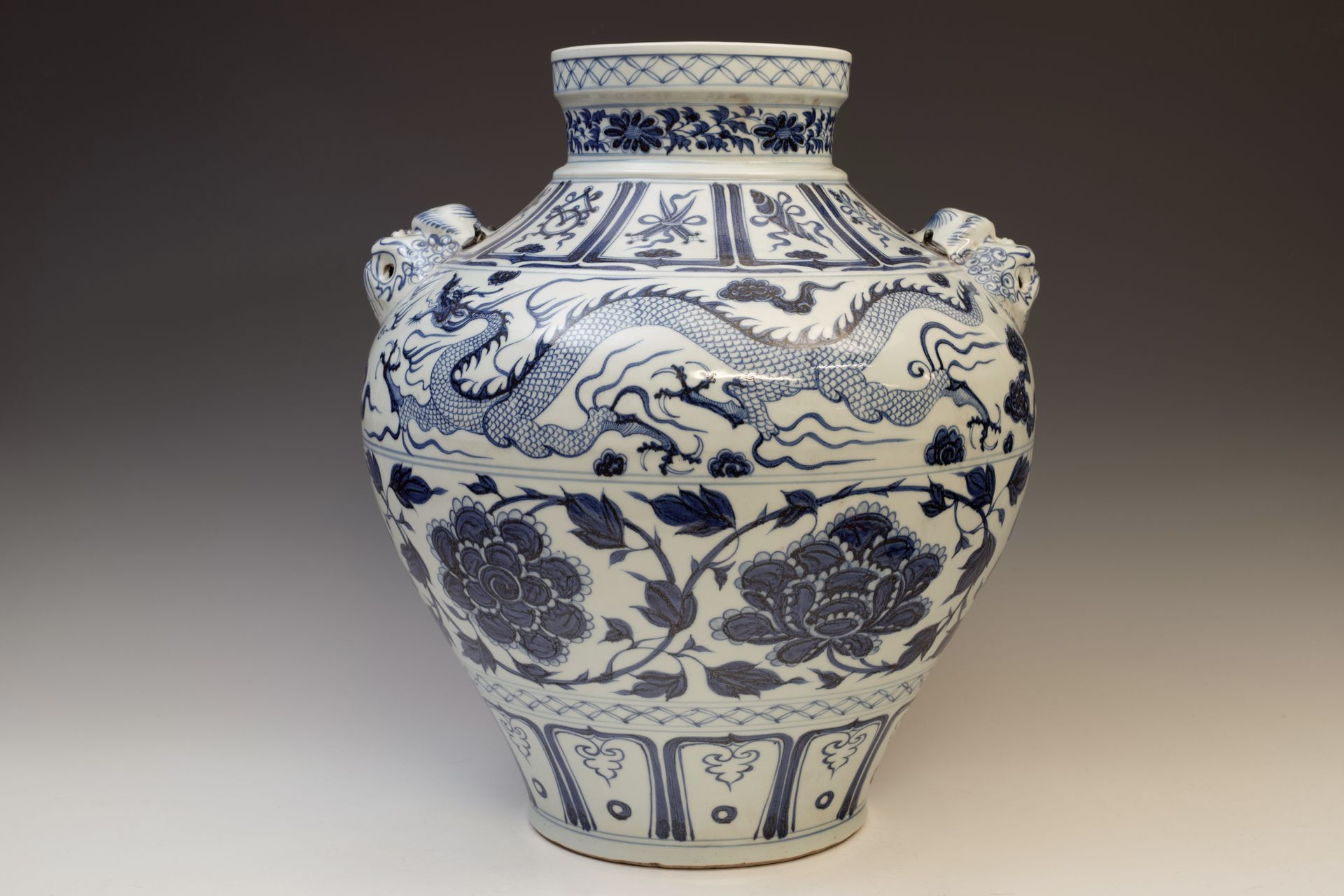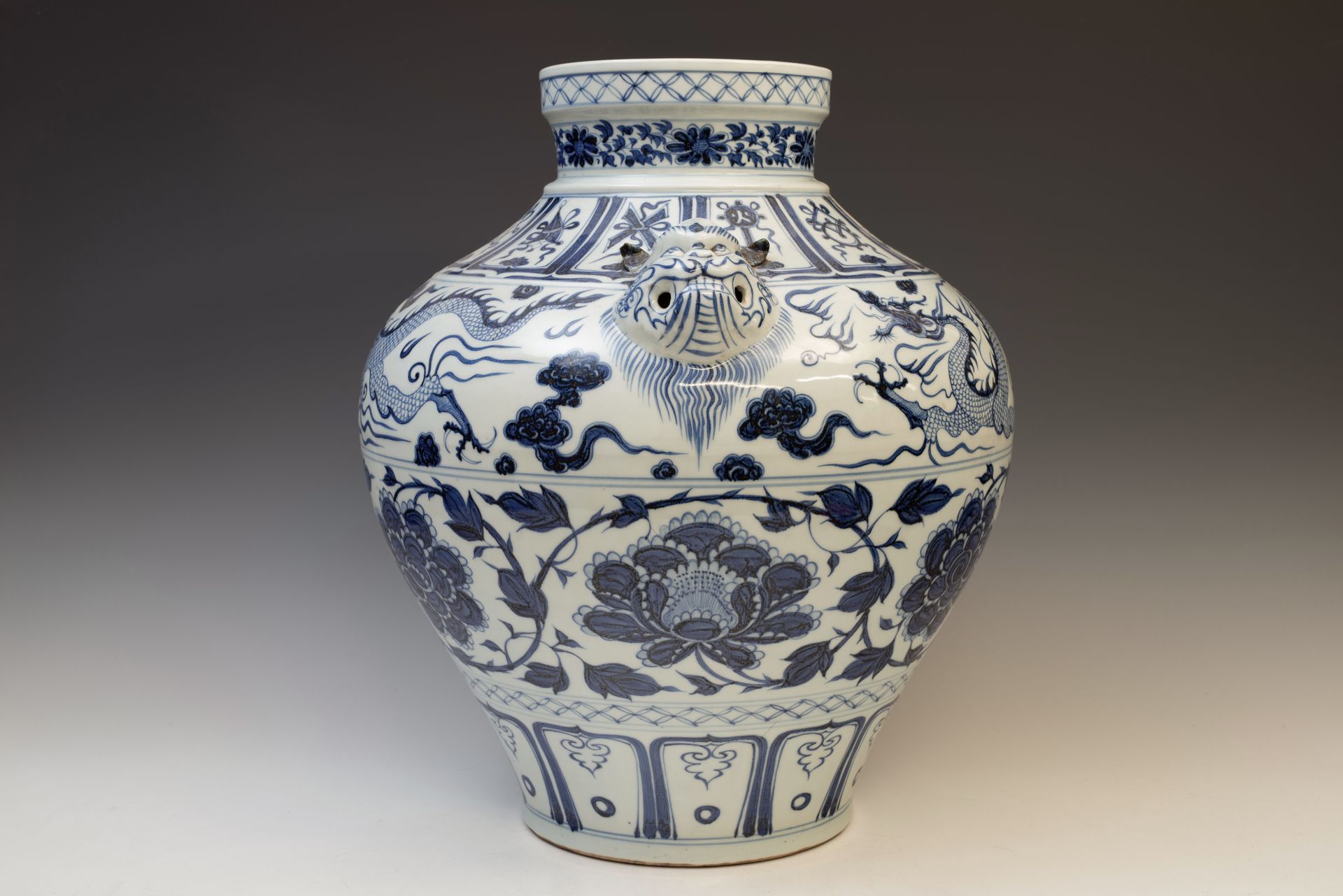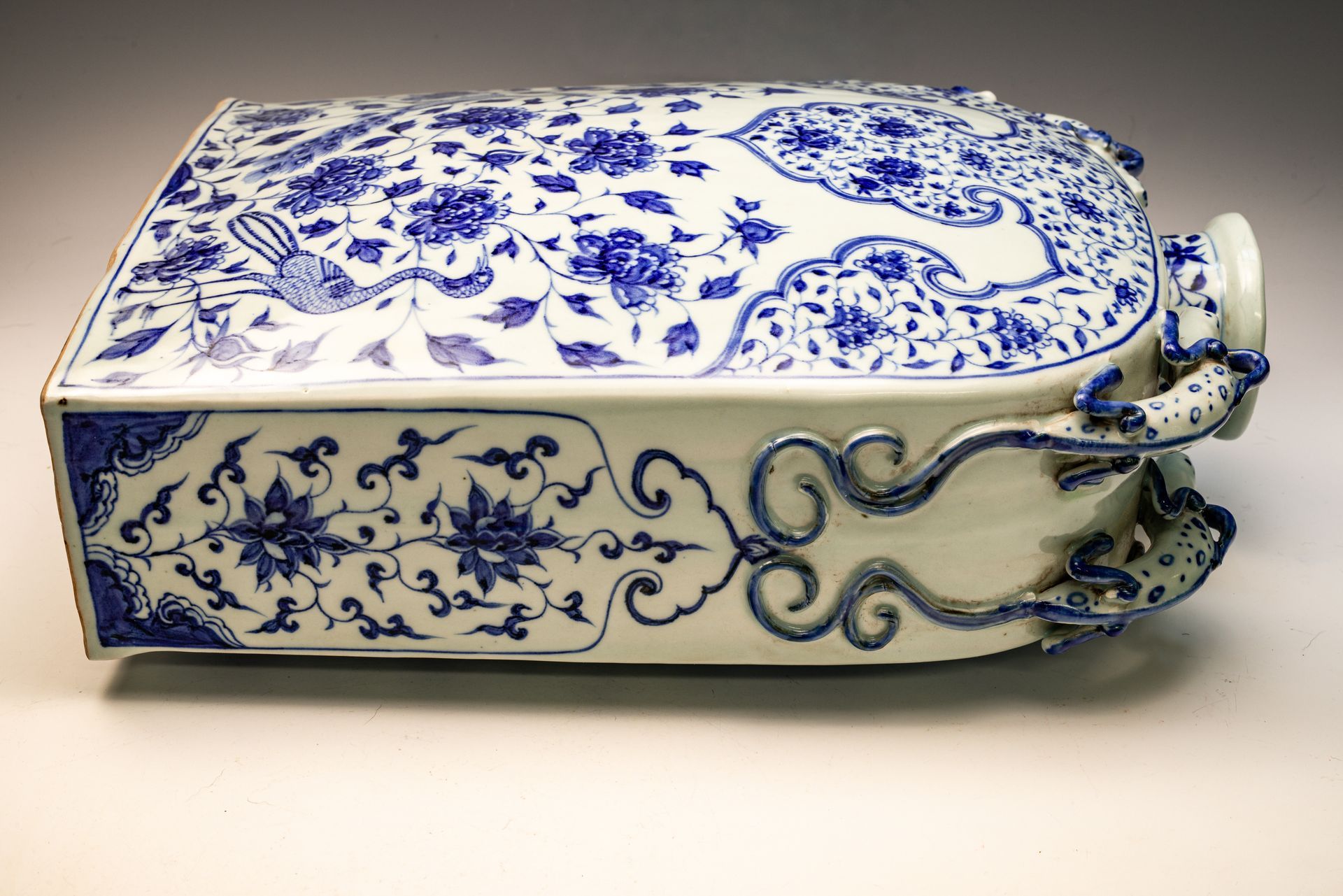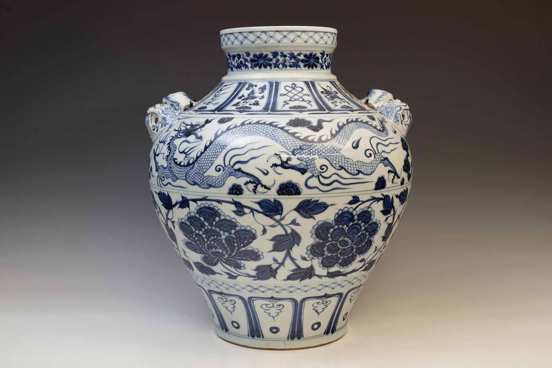**Frasco con pavos reales azules y blancos entre peonías, dinastía Yuan, acompañado de cuatro asas decorativas con forma de dragón** Este excepcional frasco ejemplifica el refinado estilo pictórico típico de la dinastía Yuan. Elaborado con maestría a partir de cobalto azul samali importado, este material se caracteriza por su singular tono negruzco. La acumulación de cobalto a menudo crea el distintivo efecto de amontonamiento, que da lugar a la formación de manchas negras o reflejos plateados al romper la superficie del vidriado. Esta particularidad sirve como indicador vital de la procedencia del frasco, ya que el cobalto importado ha cesado su disponibilidad hace más de cinco siglos. Además, la evidencia de descascarillado en el bizcocho confirma su considerable antigüedad. El frasco mide aproximadamente 39,5 cm de altura. ppjrs
