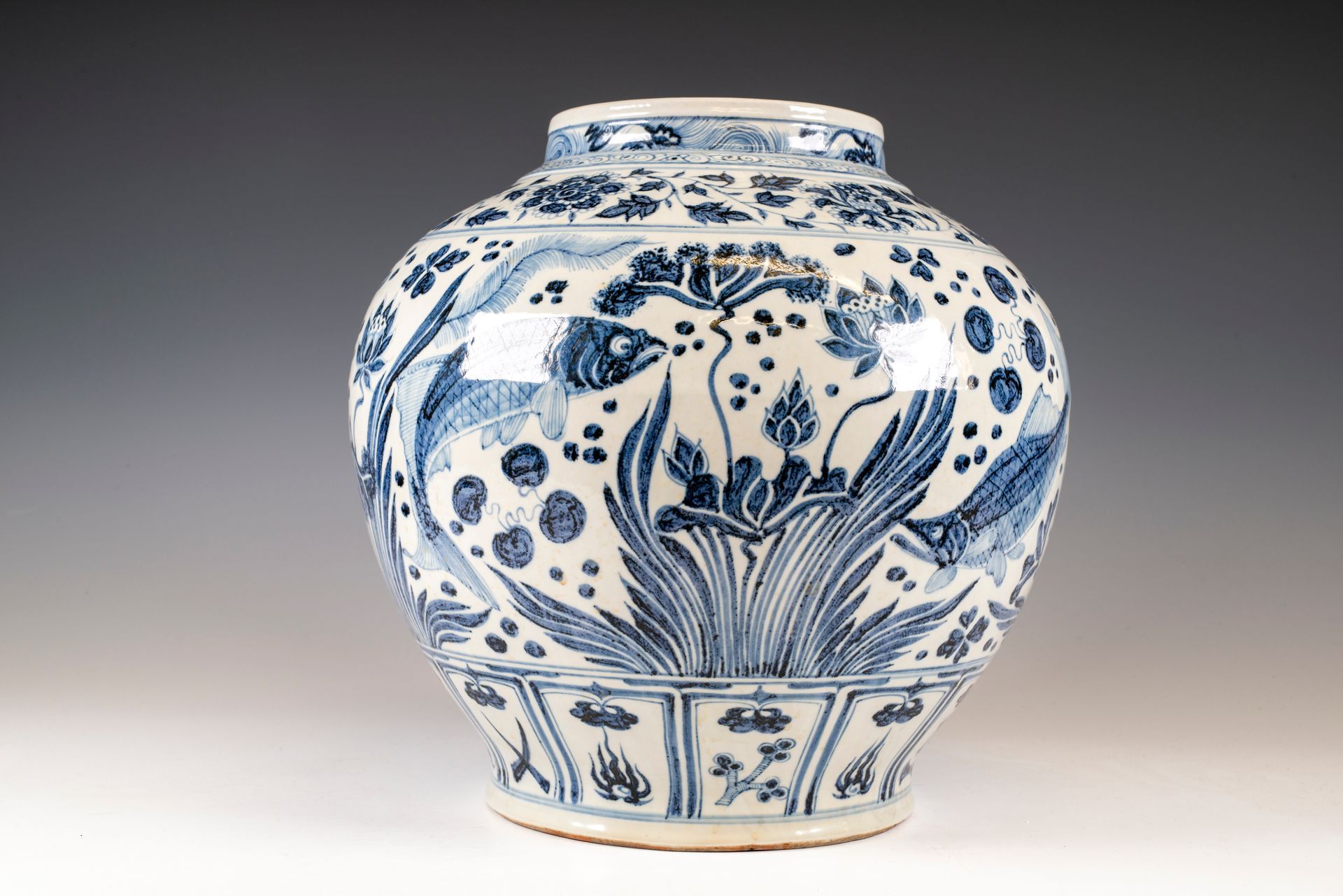 Jarrón azul y blanco de la dinastía Yuan con peces entre vegetación acuática