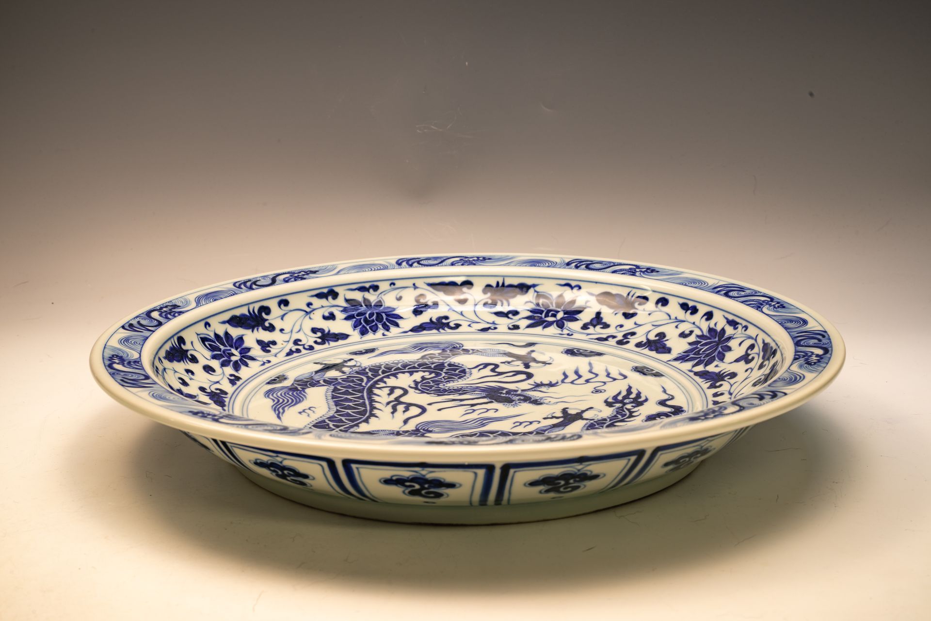 Plato azul y blanco de la dinastía Yuan con un dragón persiguiéndolo