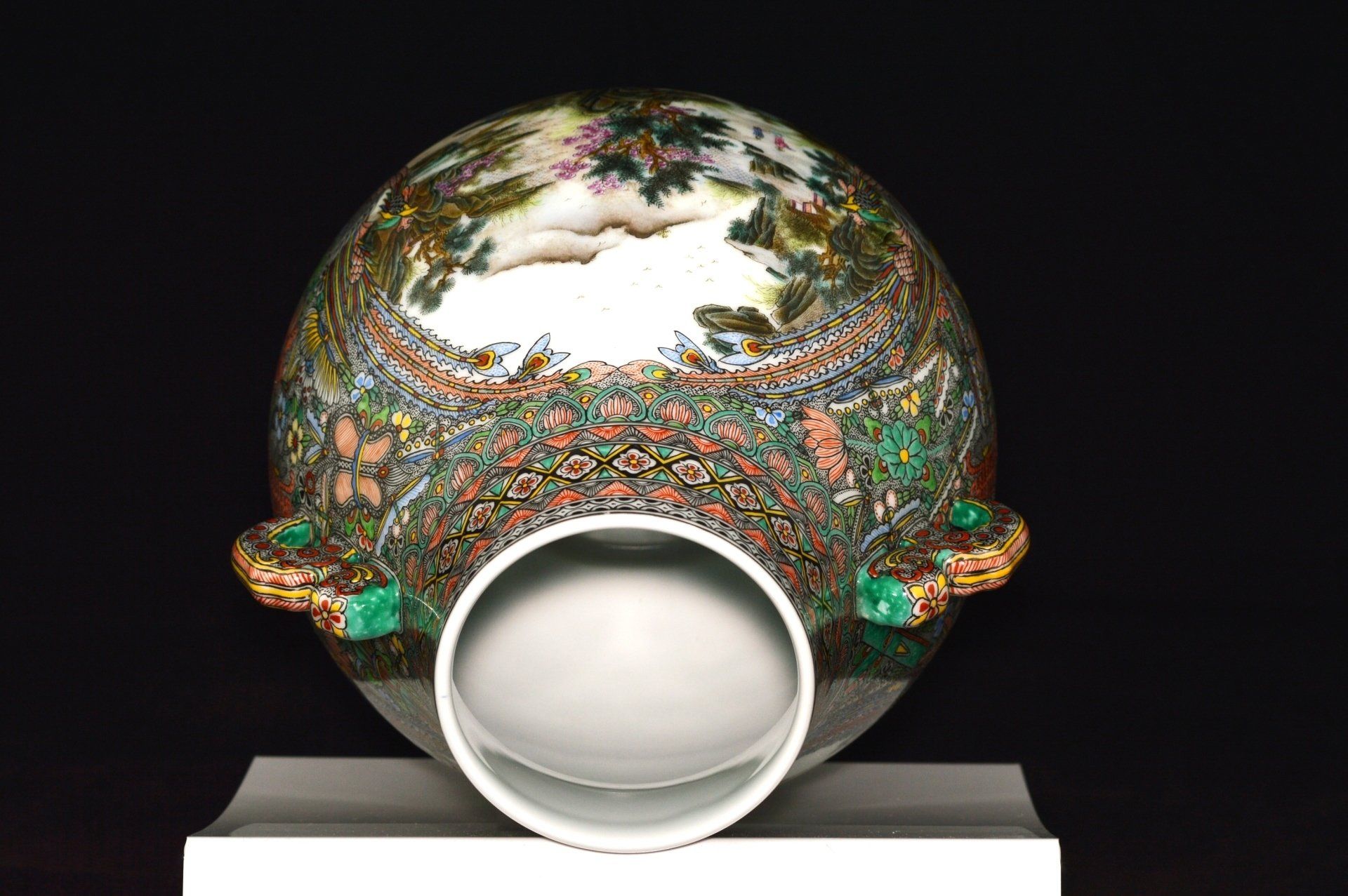 Ce vase impérial en porcelaine chinoise d'une finesse exquise, datant de la dynastie Qing, est un remarquable objet d'art. Il porte la marque spécifique de l'artiste et a été produit sous le règne de Qianlong, entre 1736 et 1795. Le savoir-faire dont témoigne sa réalisation est remarquable, avec ses multiples bandes et couches de décorations complexes qui attestent de son talent exceptionnel. Le vase présente des éléments incisés, tandis que la bande qui orne son épaule est parée d'innombrables gouttelettes d'émail appliquées avec une précision méticuleuse, contribuant à sa texture visuelle unique. Le feuillage, les branches, les fleurs et les papillons sont rendus avec une délicatesse remarquable. Un examen attentif, de préférence à la loupe, des feuilles, des fleurs et des branches révèle une profondeur de détails, une vivacité des couleurs et des nuances qui rehaussent l'équilibre et la richesse de l'ensemble. Les collectionneurs doivent être capables de reconnaître les caractéristiques qui distinguent une belle pièce d'une pièce véritablement exceptionnelle, voire d'un chef-d'œuvre. Un examen approfondi de nombreux objets de la dynastie Qing révèle qu'ils étaient souvent réalisés par des artisans moins expérimentés, et qu'ils manquaient de la profondeur, du détail et de l'équilibre que l'on retrouve dans les pièces de qualité supérieure. Le souci du détail, l'harmonie des couleurs et les nuances sont essentiels pour apprécier ces différences. Le décor de ce vase est principalement réalisé au pinceau fin, certains détails étant probablement rendus à l'aide d'un pinceau à un seul poil. On note un léger défaut de cuisson à la base bleue : l'émail bleu s'est légèrement rétracté, laissant apparaître quelques petites zones blanches. Par ailleurs, le revers du vase présente un poème, tandis que la base arbore fièrement la marque Qianlong, alignée au centre du décor principal – une caractéristique des porcelaines impériales Qianlong. Ce vase impressionnant mesure environ 41 cm de haut, ce qui en fait une pièce de choix pour toute collection.