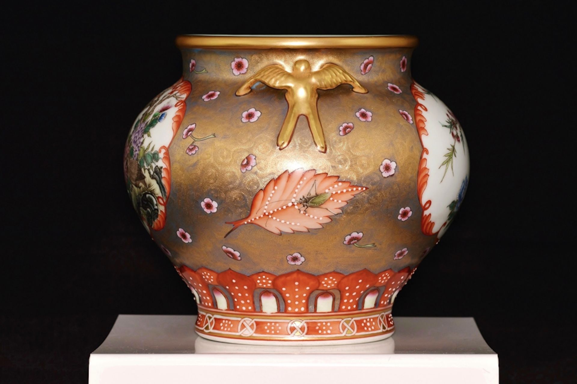 Bandes dorées au feu de trois chefs-d'œuvre de vases hommage cuits dans des fours différents (photo principale : Ru, Yaozhou, Guan et gros plan des bandes)