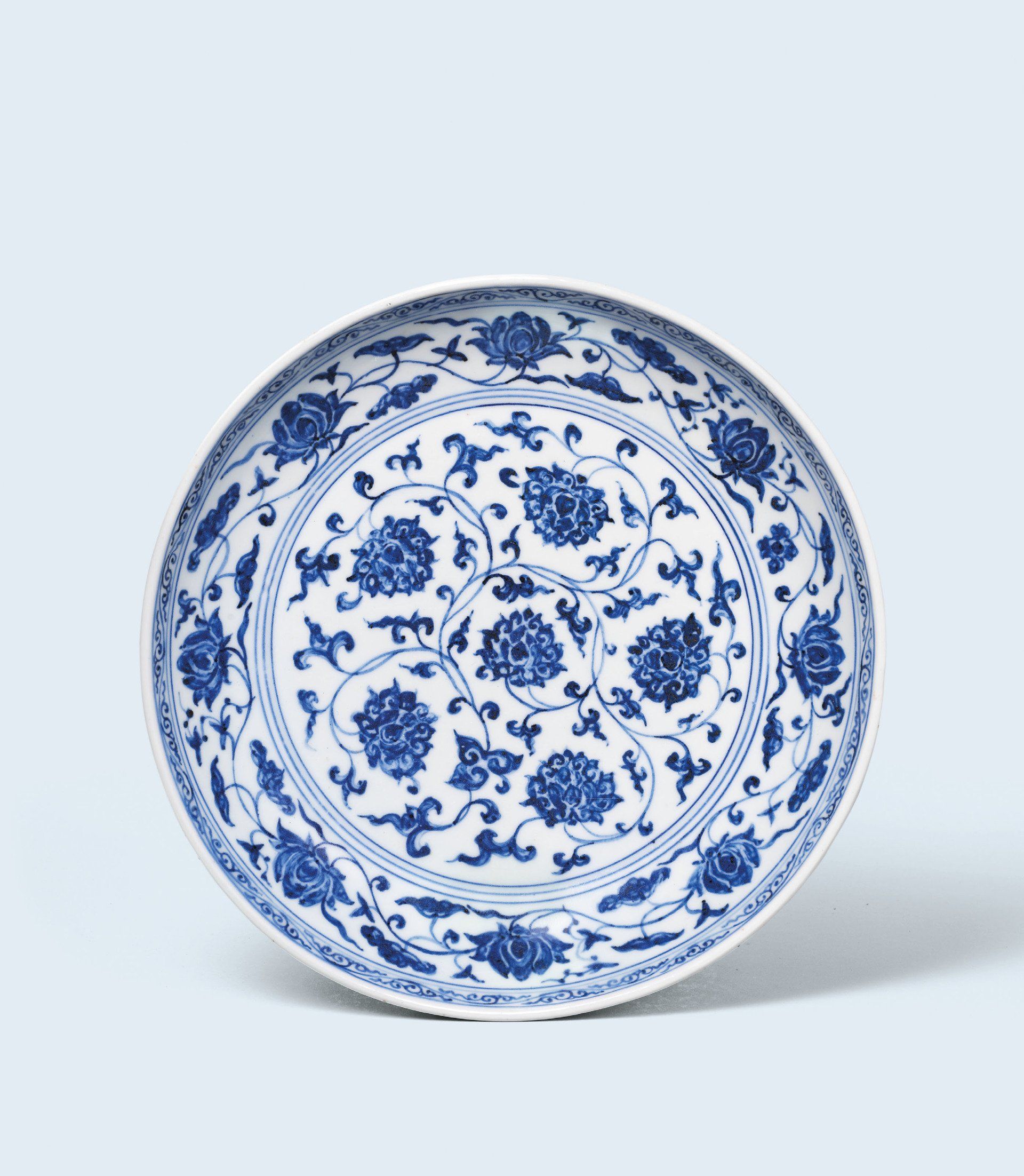 Christie's a vendu ce plat Ming Xuande en forme de lotus bleu et blanc.