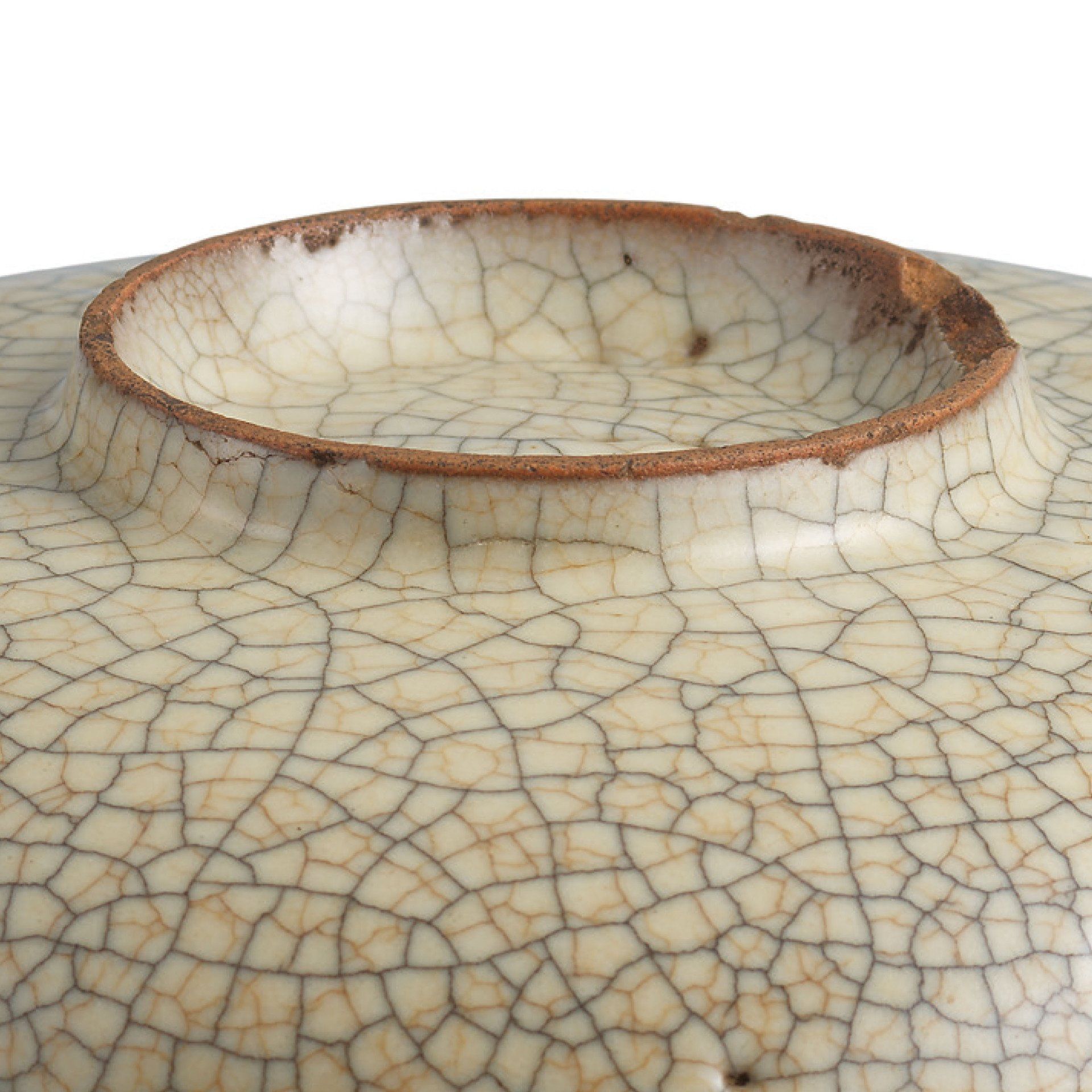 Les trois pièces du four Ru exposées sont des exemples de céramiques marchandes. Auparavant, les seuls spécimens connus de ce type de céramique étaient ceux collectionnés par l'empereur Qianlong sous la dynastie Qing. Cependant, suite à l'intégration de la Chine au marché mondial, de nombreuses pièces et collections exquises, restées cachées, sont désormais accessibles. Les céramiques marchandes sont généralement plus petites que les céramiques impériales commandées par la Couronne et présentent un émaillage complet, y compris l'anneau de pied. Ces objets étaient cuits à l'aide de moules munis de griffes, qui les surélevaient au-dessus du fond du four. De ce fait, ils présentent des marques d'éperon de la taille et de la forme approximatives de graines de sésame – des caractéristiques distinctives propres aux céramiques marchandes et aux céramiques d'hommage. Il est important de noter que les céramiques marchandes n'atteignent pas le raffinement des céramiques d'hommage, dont les exemplaires les plus exquis étaient ornés de bandes de cuivre doré au feu et offerts à l'empereur Huizong en guise de tribut.